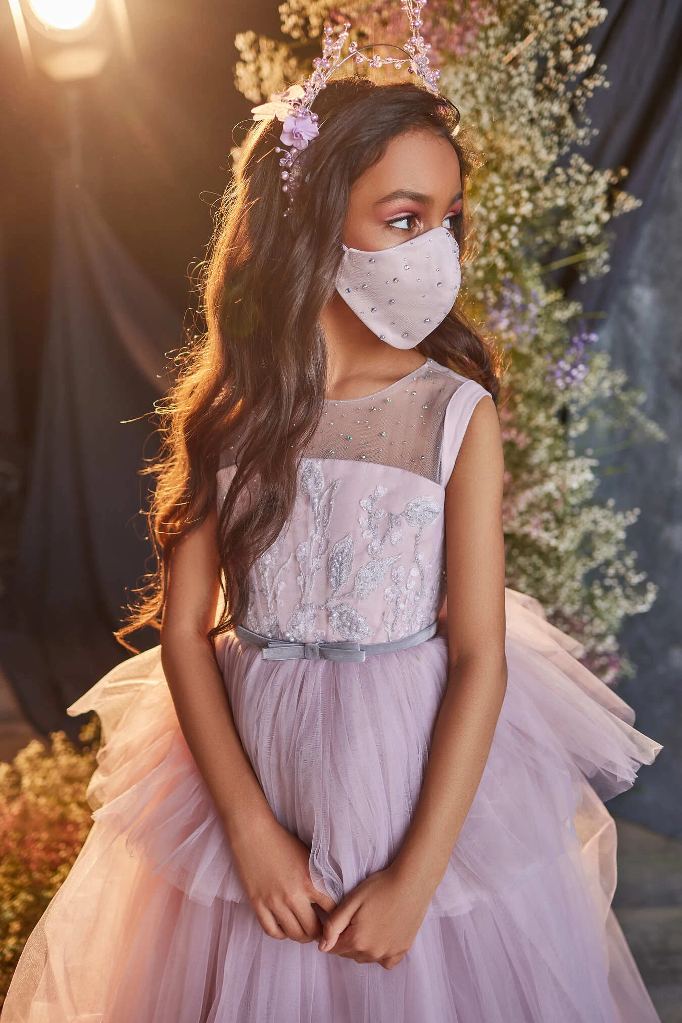 A sleeveless tiered maxi dress that shows off a short peplum, accentuating her waist. Detailing includes a velvet bow waistband and delicate contrasting embroidery with sparkling jewels on the bodice. The shoulders are trimmed with satin fabric. A fluffy layered skirt elegantly flows into a short train. Lovingly crafted down to the smallest detail, this stunning maxi dress will delight any guest on her big day, whether at a prom, a wedding, or a red carpet event!