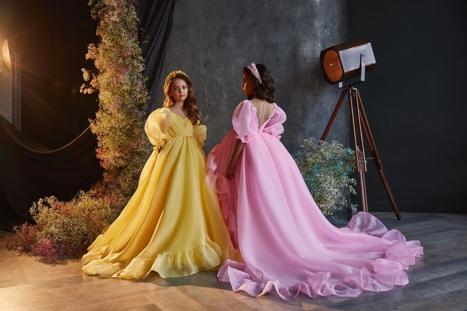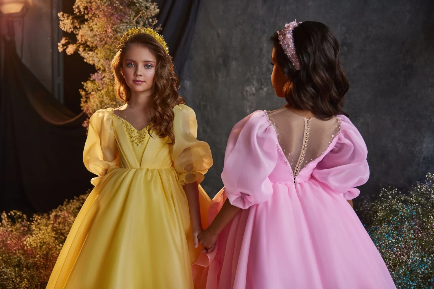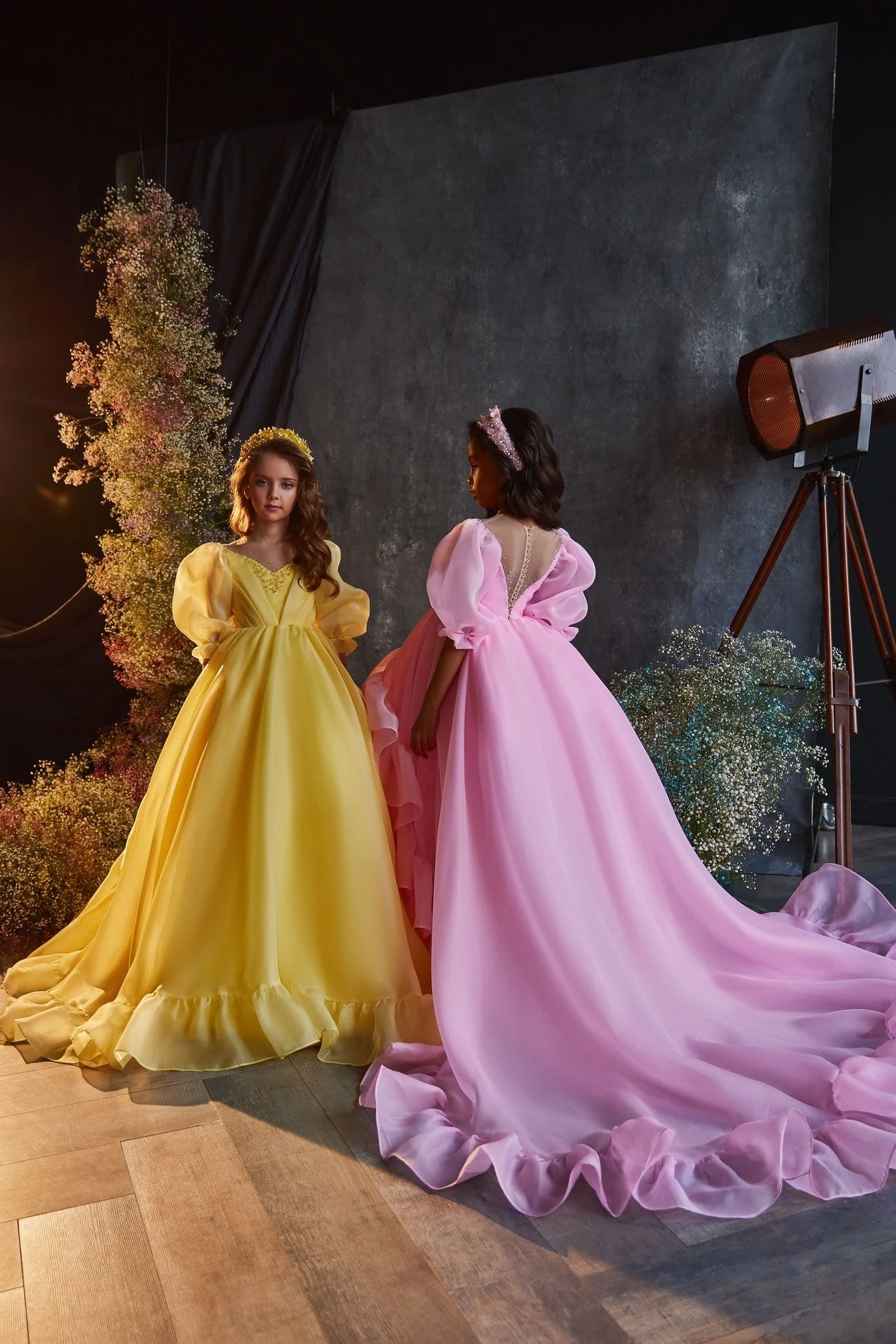 A princess-style pink dress for kids with short puffed sleeves is the best choice for her birthday, bat mitzvah, or wedding. This gown in yellow or pink has a stunning gathered skirt with a ruffled hemline and a short train. The symmetrically draped front of the dress features a sheer V-neck accentuated with sparkling jewels. The back of the dress has a V-cut neckline finished with crystal summarys and beads. There is an option to order this magnificent princess dress in high-low design.