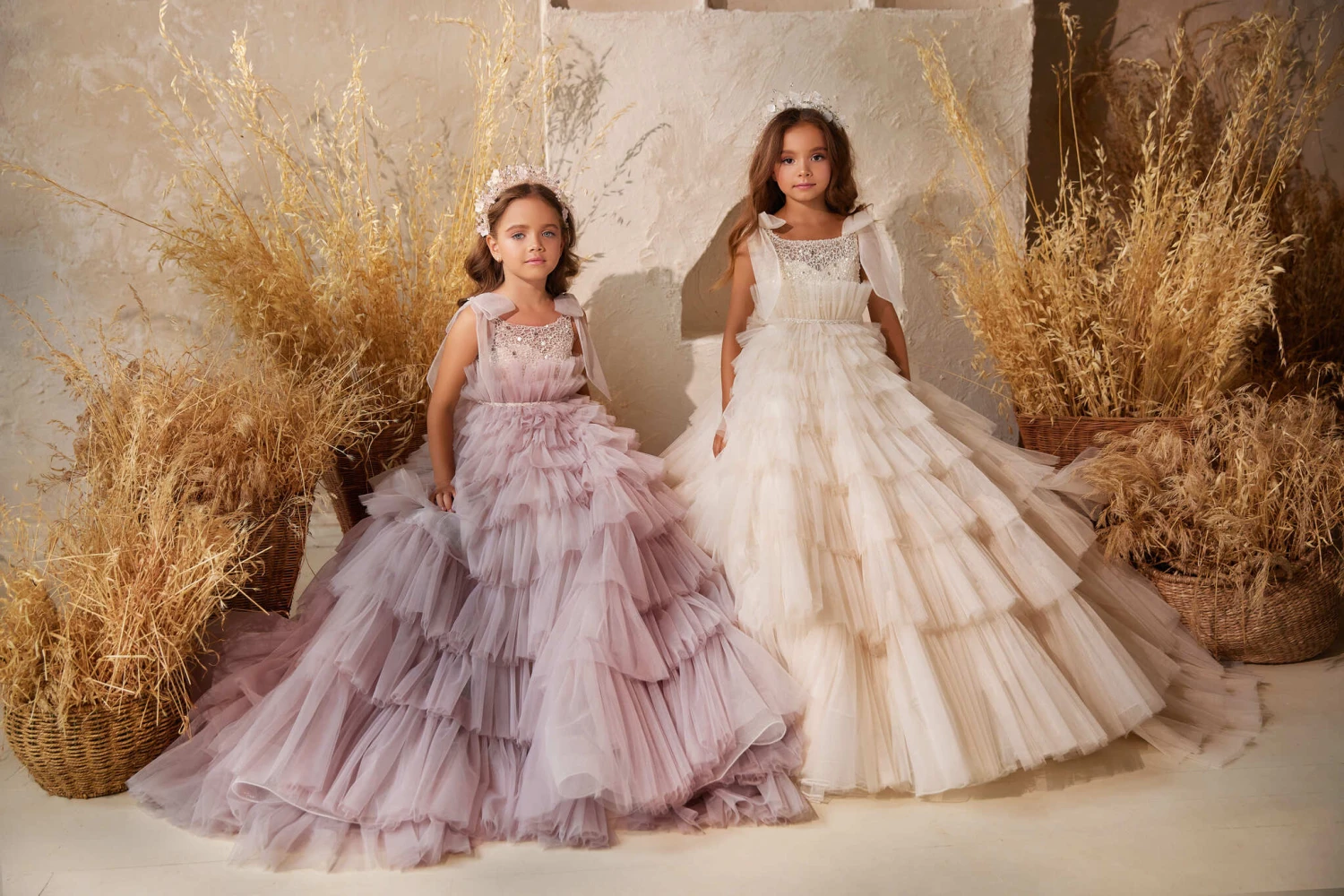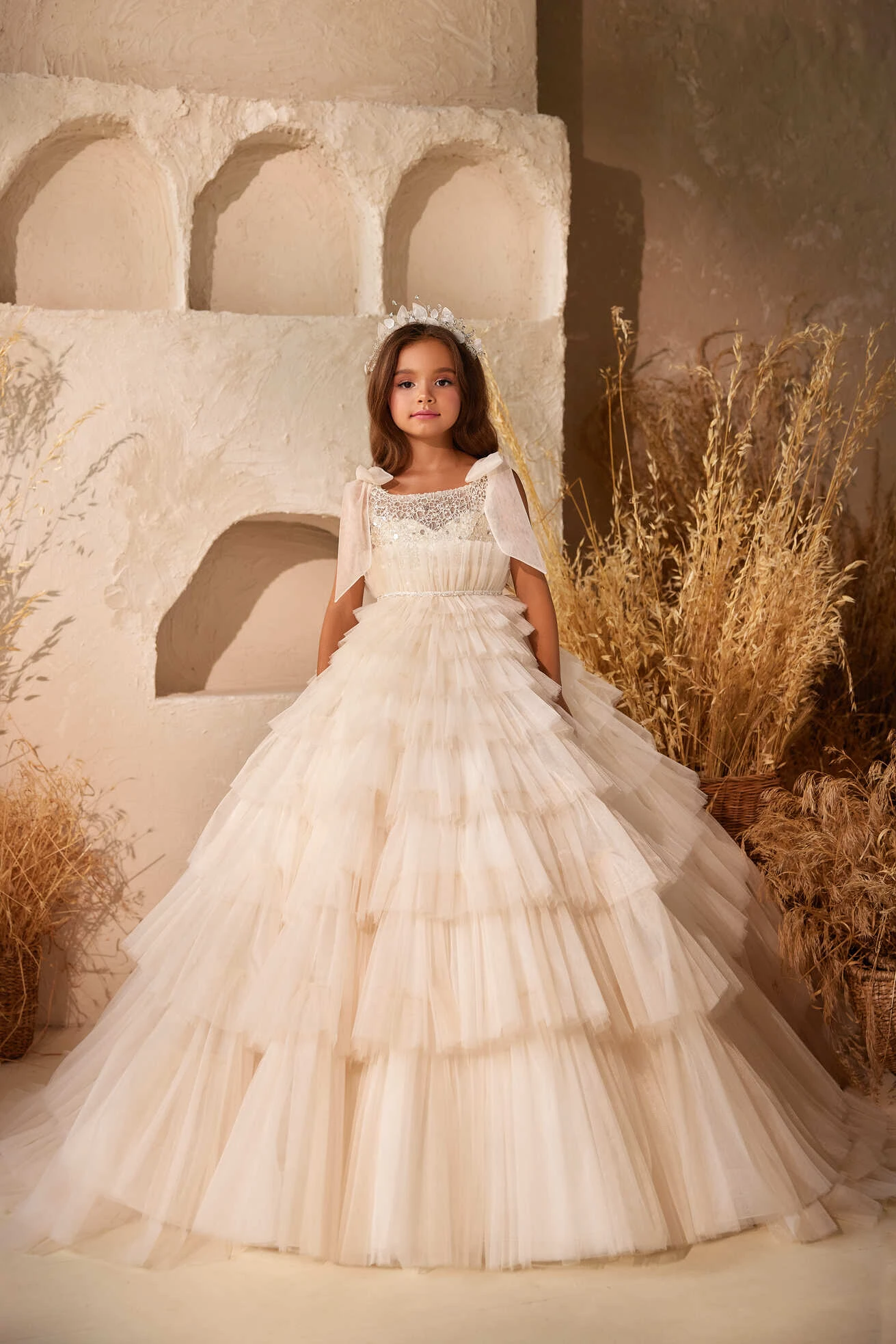 The overall design, from the detailed beadwork on the bodice to the flowing layers of the skirt, suggests a dress fit for special occasions, such as weddings, pageants, or grand celebrations.