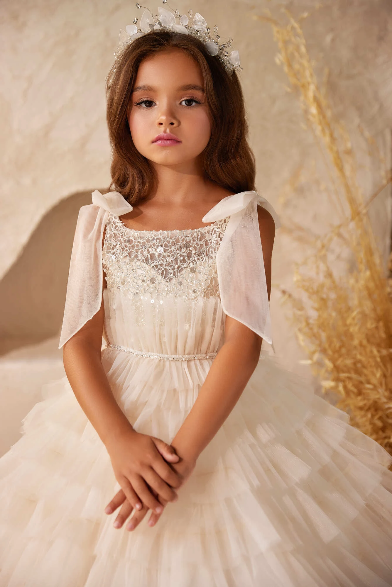 The bodice is decorated with a unique pattern of overlapping circles in different sizes. Embellished with shiny beads and sequins, these circles form a captivating mozaic on a semi-transparent mesh. On the shoulders, delicate bows made of soft tulle stand out. These bows with long tails gracefully fall down the arms. An embellished belt at the waist adds definition to the silhouette.