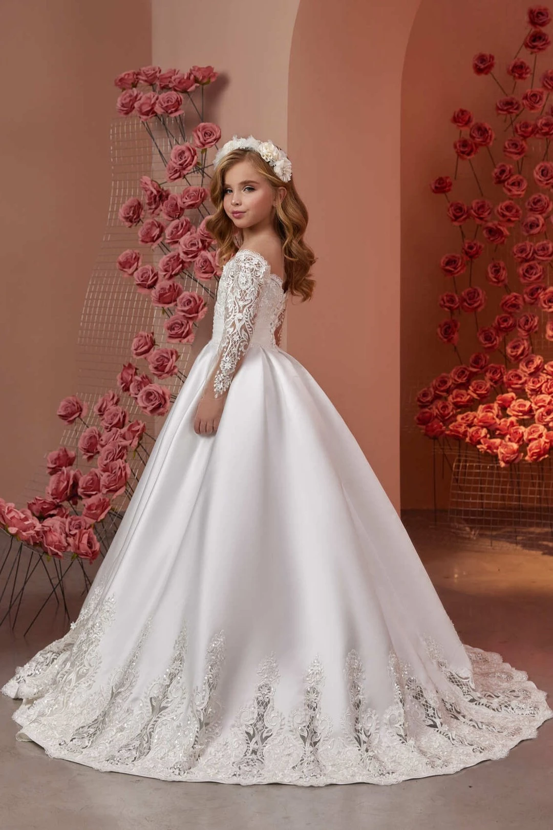 Upgrade your daughter’s communion outfit with the Andromeda Sophisticated Communion Dress. The long satin dress features delicate lace embroidery trim and an illusion neckline for an elegant touch. The gentle lining ensures comfort while the corset lacing closure provides a perfect fit. Made with high-quality bridal satin for a luxurious look.