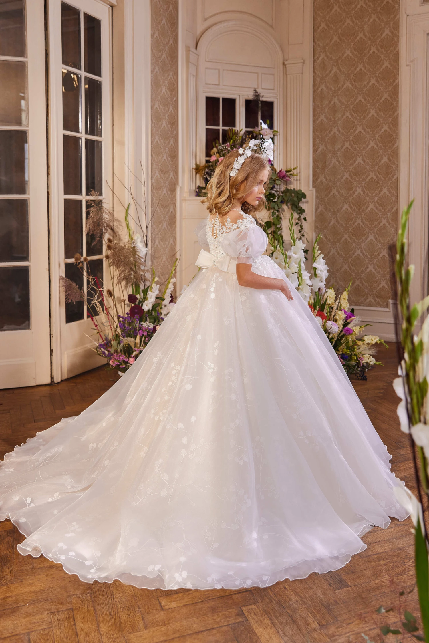Experience a touch of elegance and sparkle with our Bergamo Flower Girl Dress. The ballgown design is accentuated with a delicate lace detailing and a train for added drama. The off the shoulder puff sleeves and illusion neckline complete the look for the perfect touch of sophistication for your little one.