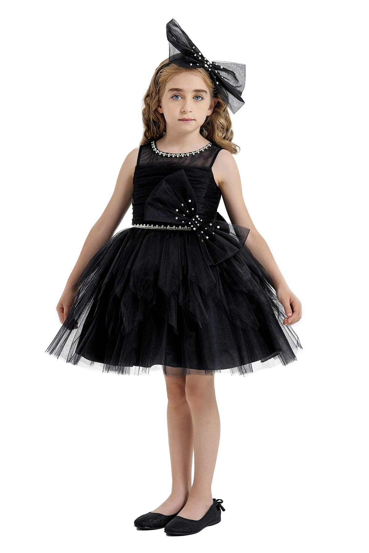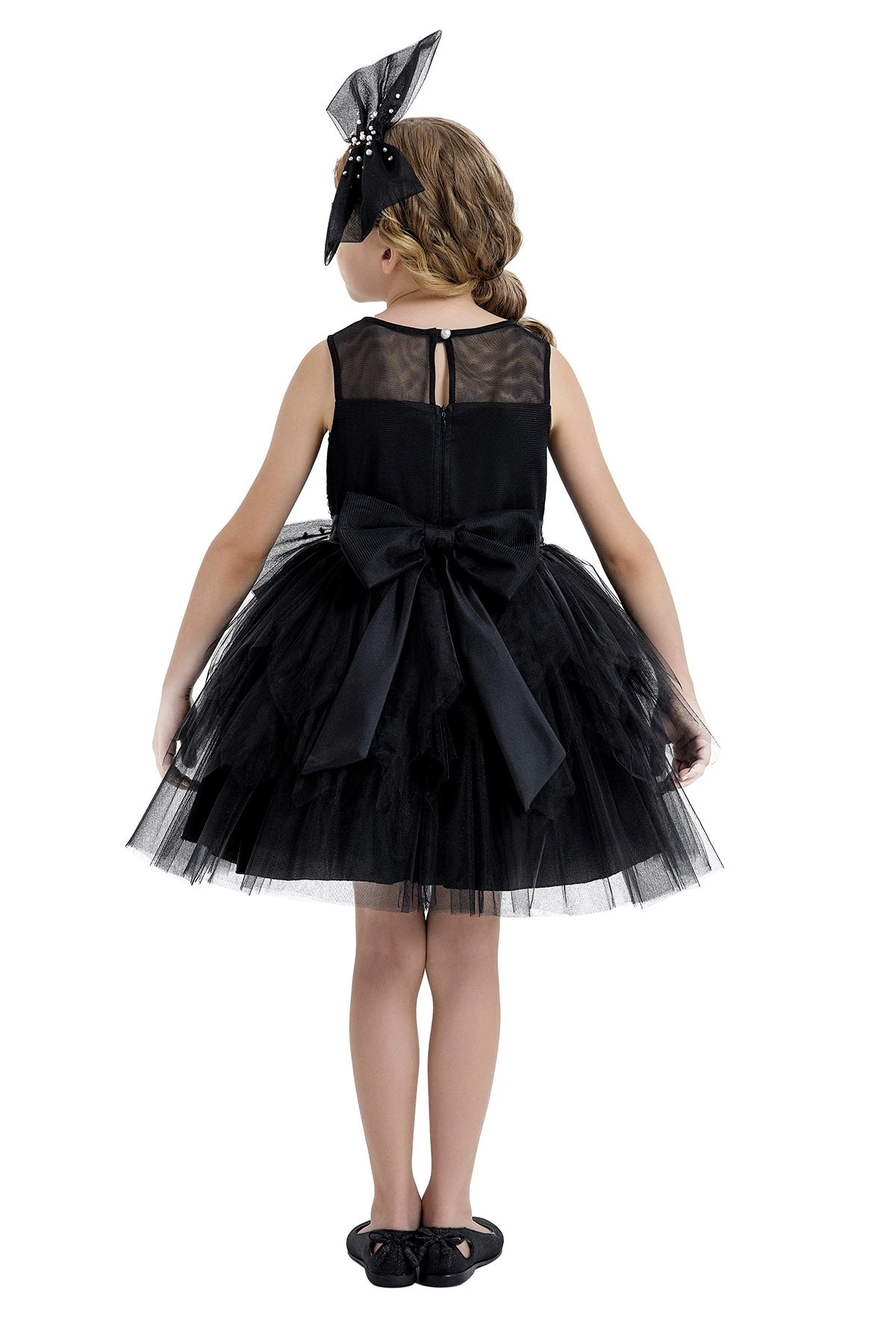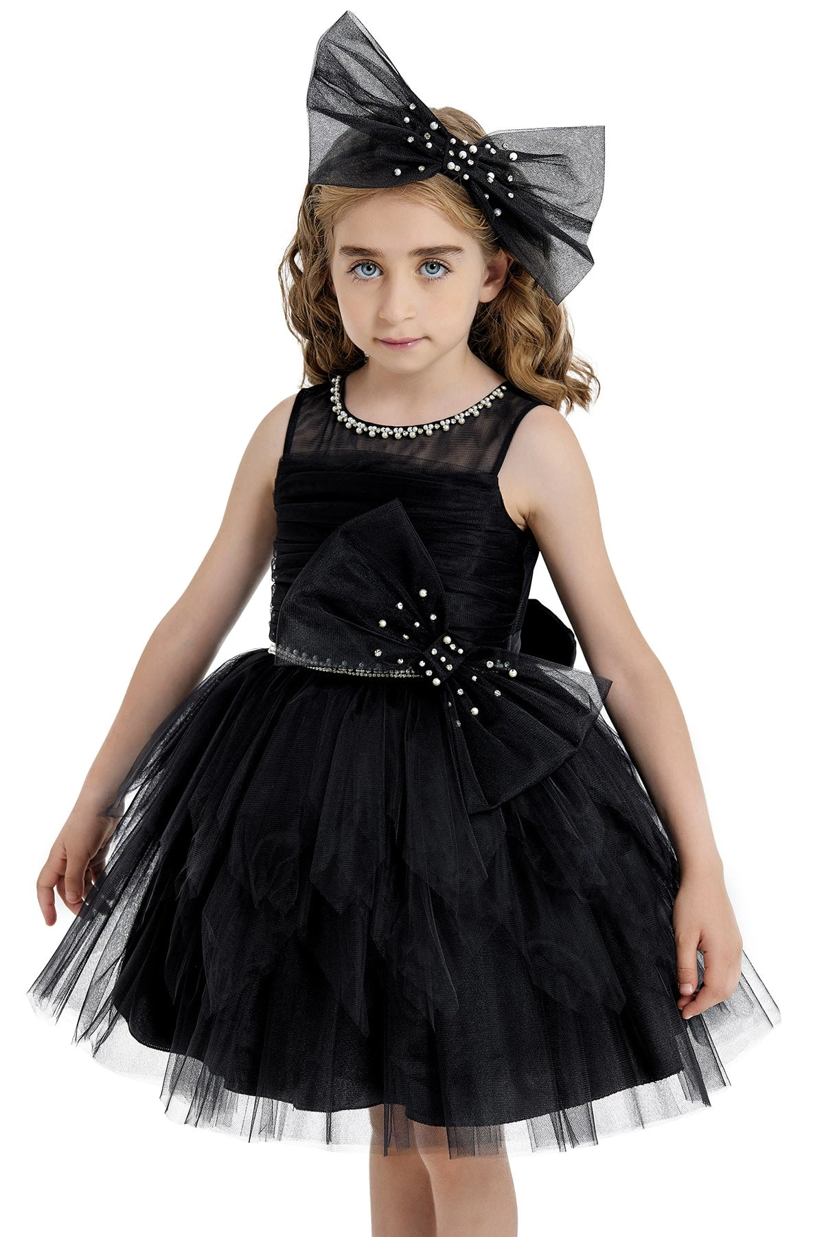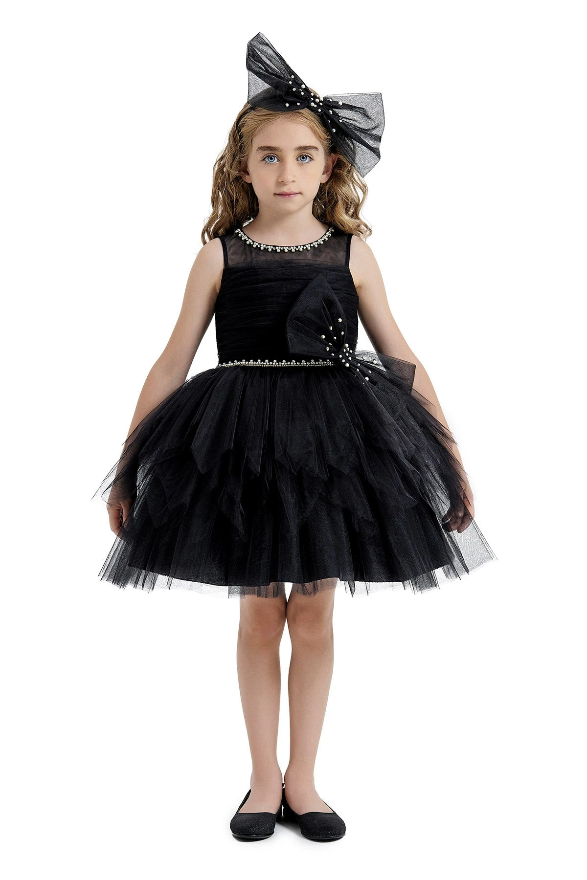 This sleeveless Black Tulle Dress for Girl with an Oversized Bow is a masterpiece of detail and design, featuring exquisite pearl and stone embroidery set against a backdrop of delicate transparent tulle. The bodice of this Black Tutu Dress is elegantly crafted with horizontal pleats. The voluminous pixie skirt is accentuated by a triangular cut layer that adds depth and movement. The waist is a showstopper, adorned with matching pearl and stone embroidery and highlighted by an impressive tulle bow, adding a touch of luxury. The back of the dress is just as charming, with a petite bow and an elegant keyhole secured with a summary closure, providing both beauty and ease. This tulle dress is perfectly paired with a coordinating bow headband, completing a look that will captivate any special occasion.