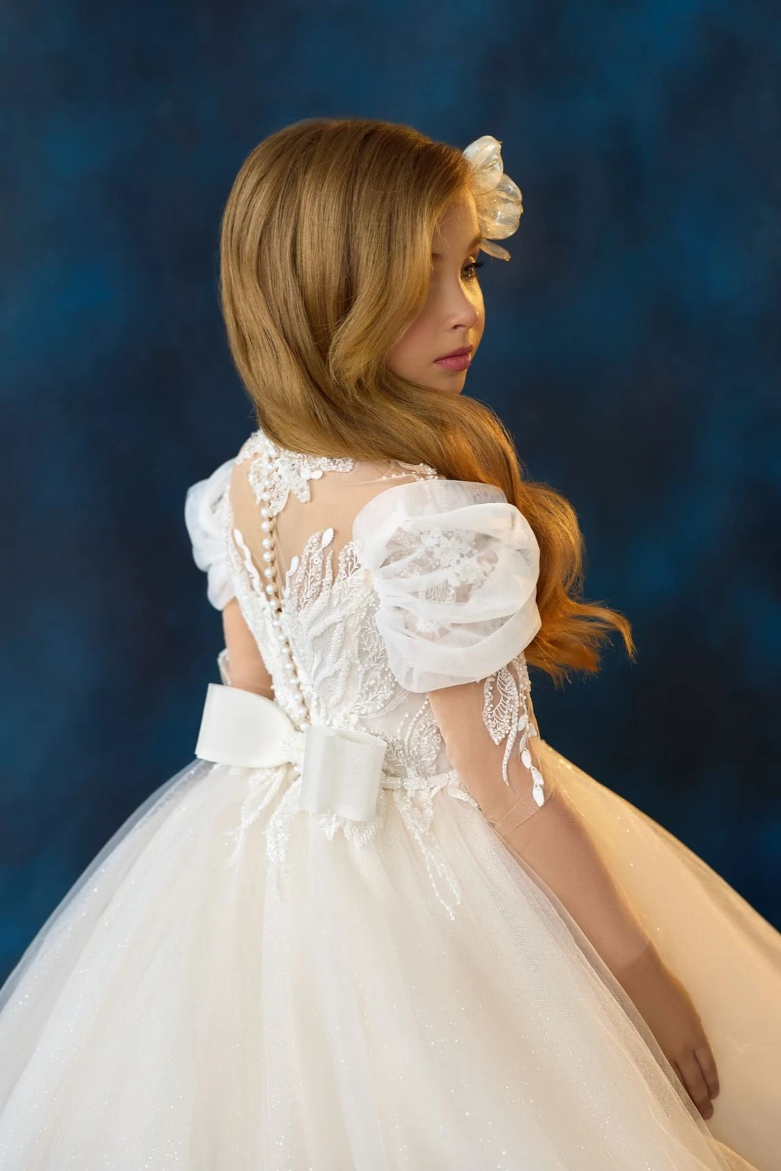The Blessing Communion Gown is a dream come true for her First Communion, combining fairytale elegance with sacred tradition. The gorgeous sheer sleeves feature intricate detailing that gracefully leads up to off-the-shoulder ruffles, reminiscent of Cinderella’s magical moment. Hand-stitched beading and designs adorn both the top and bottom hems, adding a touch of sparkle to this enchanting dress. The summary-up back is complemented by a modest bow that cinches the waist, creating a beautifully defined silhouette. As she steps down the aisle, the sparkly tulle gown opens into a wide, flowing base, capturing the light and her heart as she makes her first sacred first communion.
