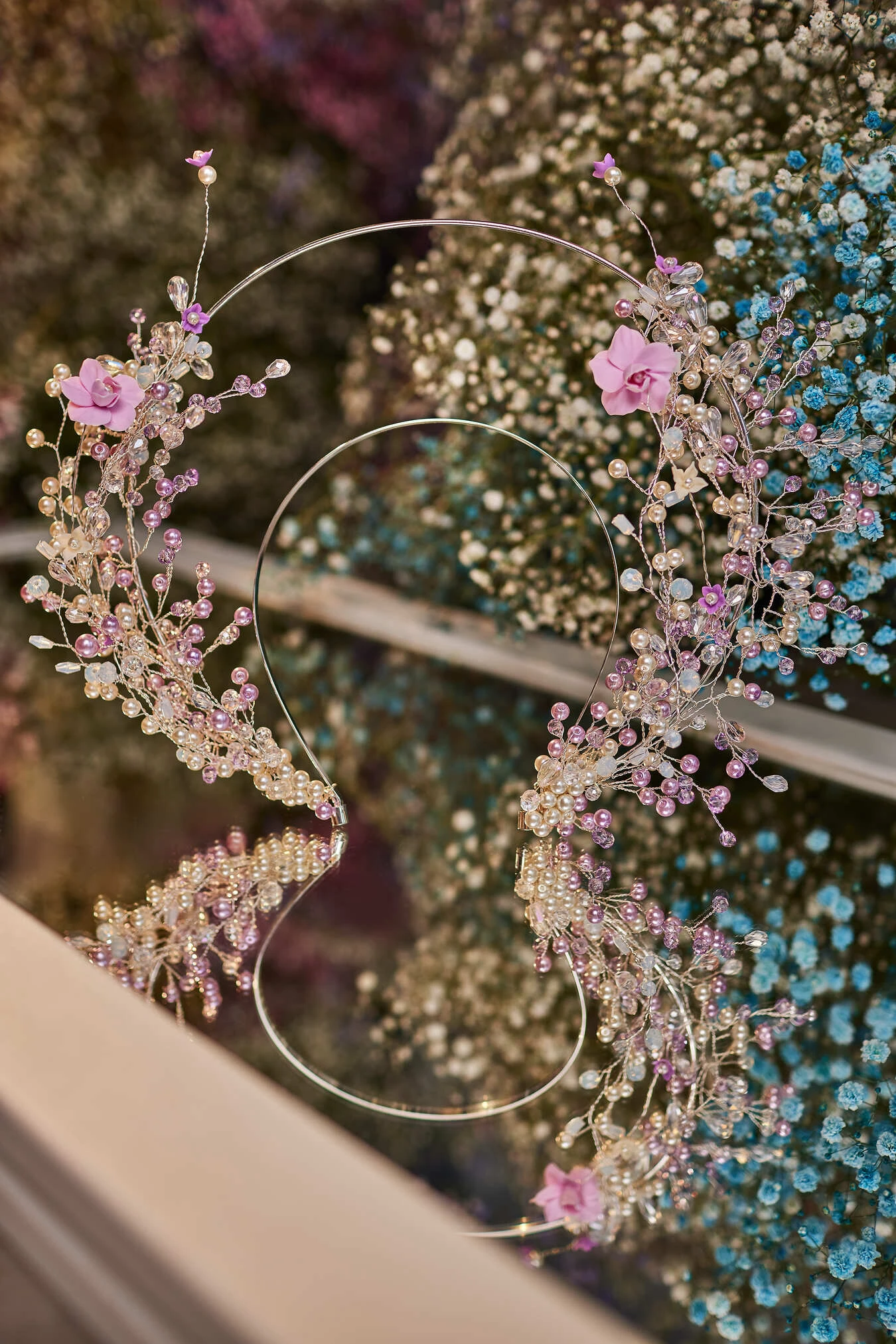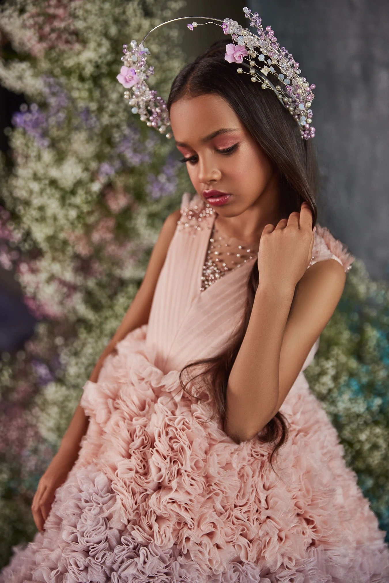 This bohemian hair crown is made of pink flowers, pearls, and beads set on the double-wired headband that sits securely and comfortably on her head, while she celebrates and dances the night away on a special day: wedding, graduation, or birthday party!
