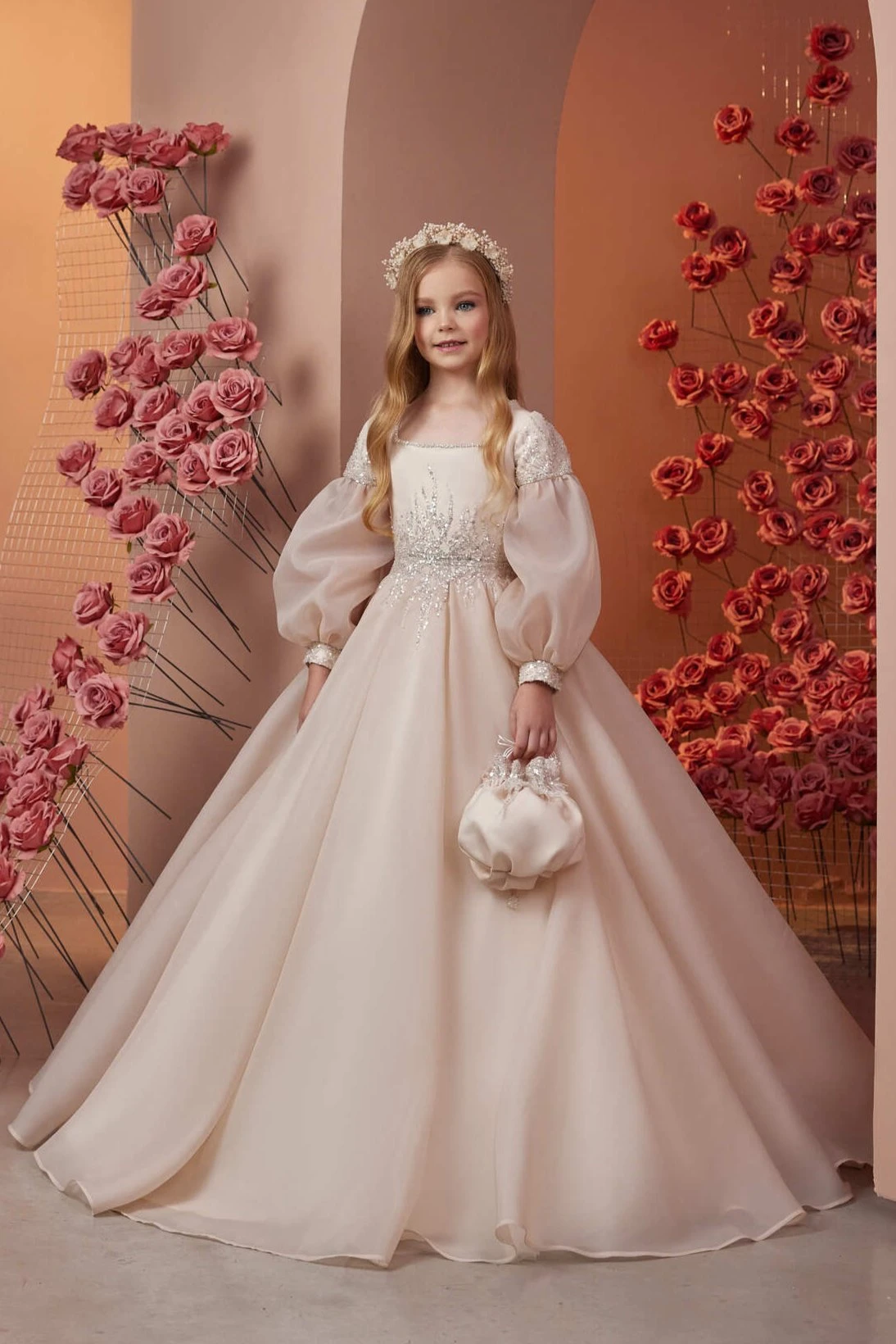 This exquisite child’s wedding dress is a quintessential piece of children’s formal wear, designed to make any special occasion unforgettable. The gown features a full-length, flowing skirt that cascades gracefully to the floor, creating an ethereal silhouette perfect for kids’ special occasion dresses. Its soft champagne hue exudes sophistication and complements the delicate lace bodice adorned with sparkling sequins that catch the light beautifully. The long sleeves are crafted from sheer fabric, adding a touch of elegance while maintaining modesty. Completing this enchanting ensemble is a floral headpiece that mirrors the blossoms adorning the backdrop, and a petite satin purse for an added touch of class.