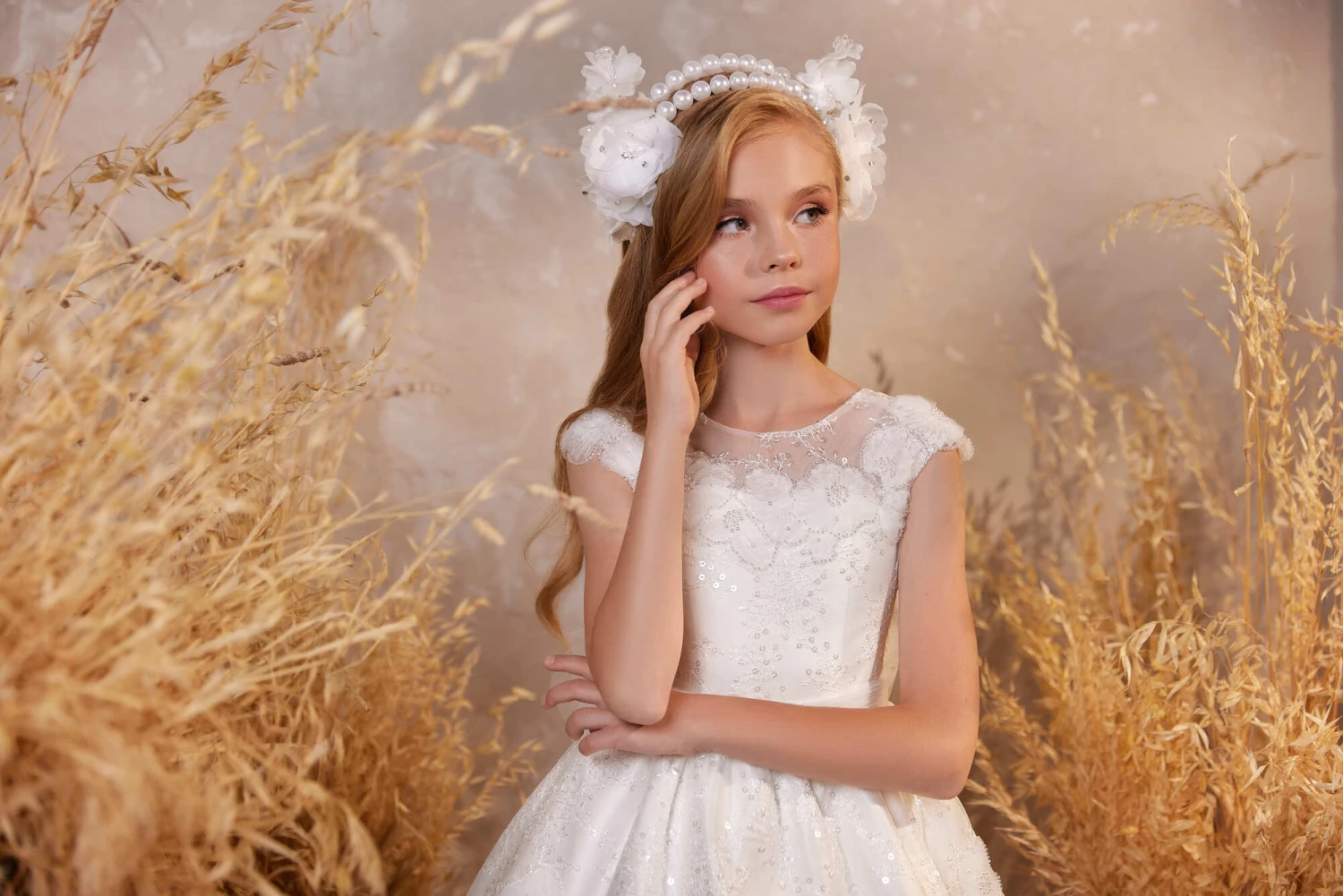 This breathtaking dress has been meticulously crafted to highlight every delicate detail, making it an ideal choice for your daughter’s special day. The dress boasts a classic white hue, signifying purity and elegance.