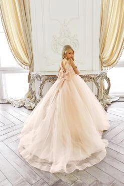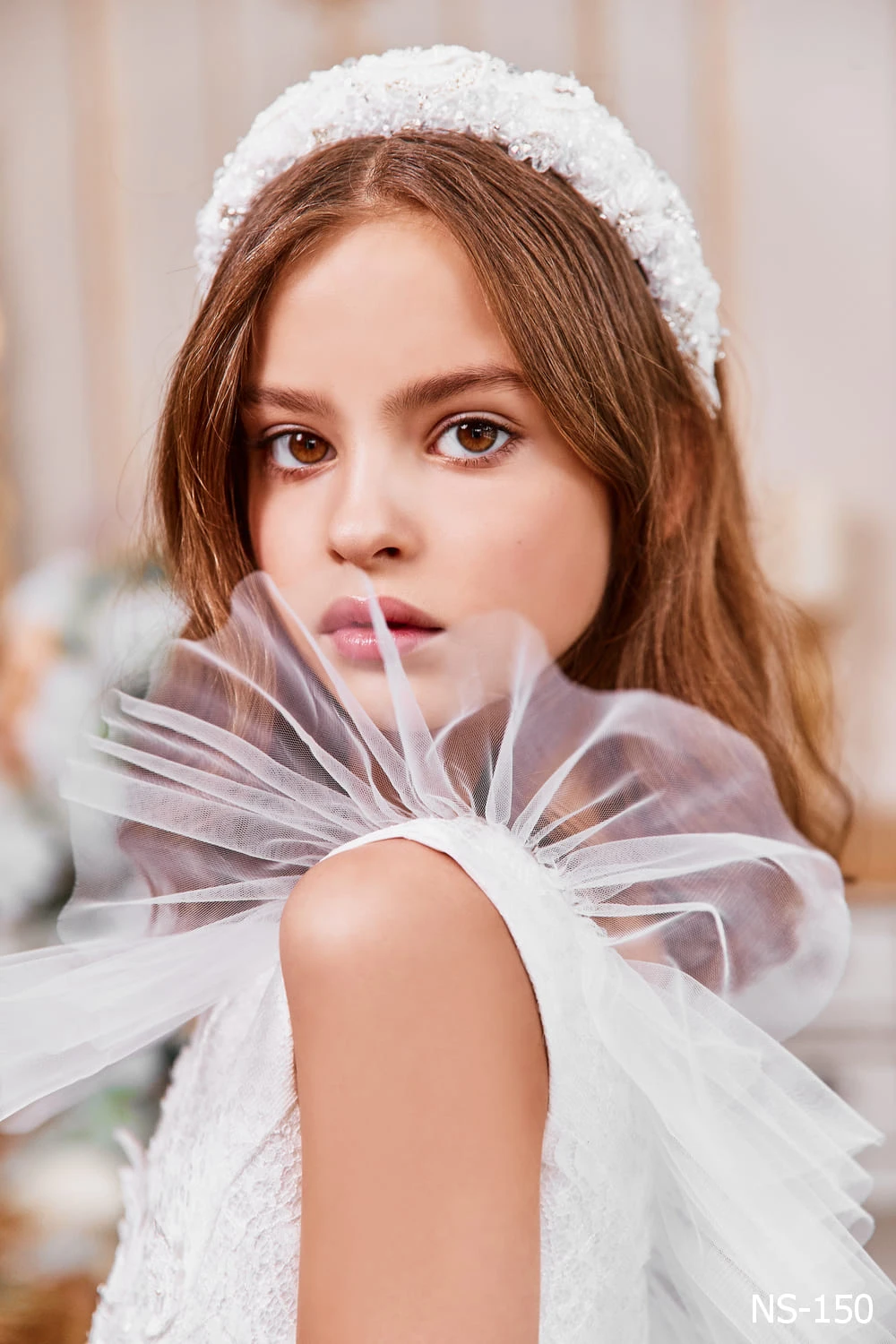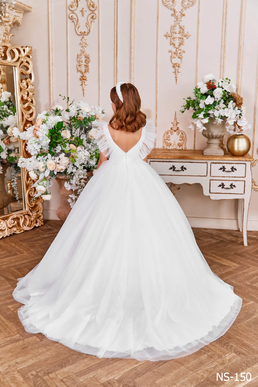 A Classy V-cut back Flower girl dresses featuring an elegant shoulder ruffle is an excellent fit for a wedding party, holiday, First Communion, or birthday party. Delicate floral lace appliques are scattered all over the bodice of the dress. A multi-layered tulle skirt comes to the floor. Pearl embellished neckline adds a finishing touch to this adorable princess dress.