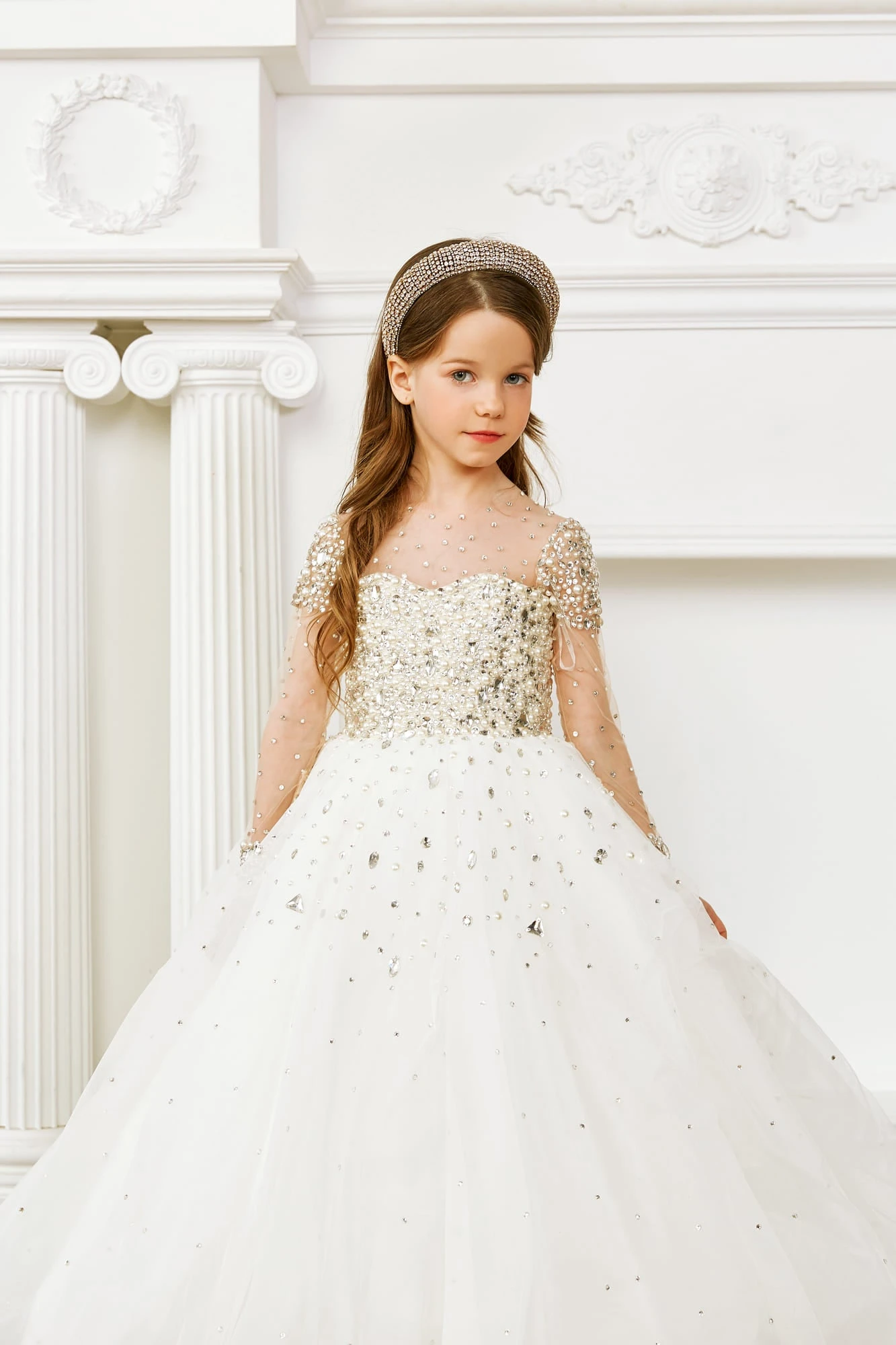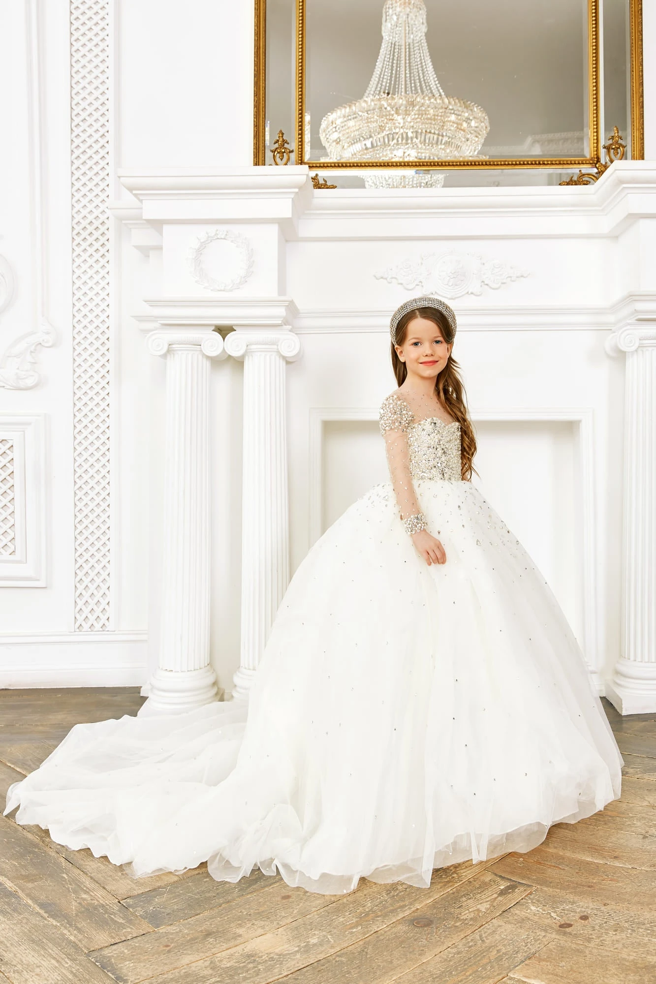Look radiant in the gorgeous DIAMOND FLOWER GIRL DRESS WITH RHINESTONES AND BEADS, featuring an illusion neckline and long sleeves of tulle and rhinestones. The luxurious train adds a touch of elegance to this special occasion dress. Perfect for weddings, prom, or other formal events.