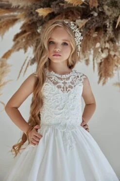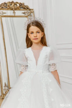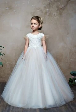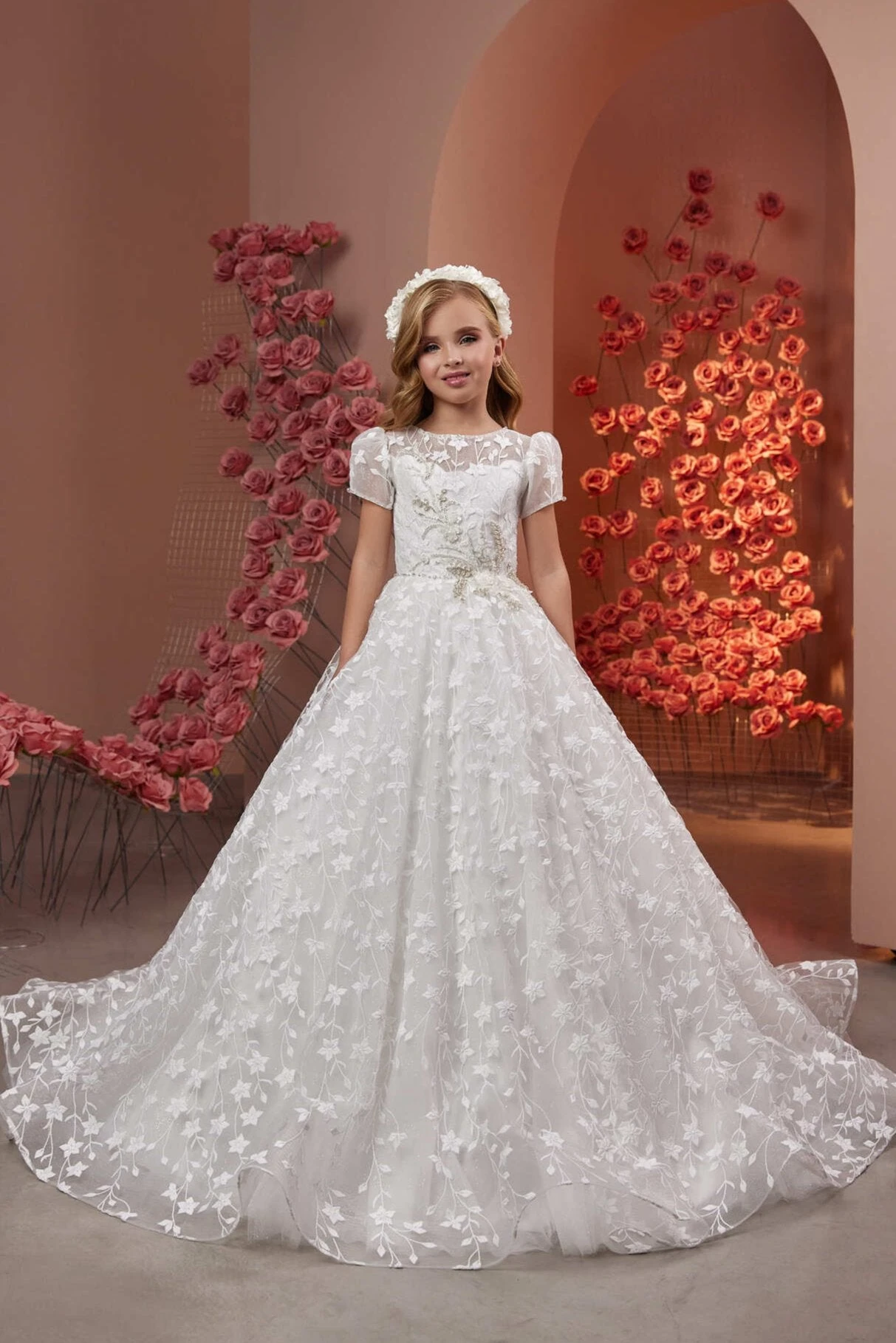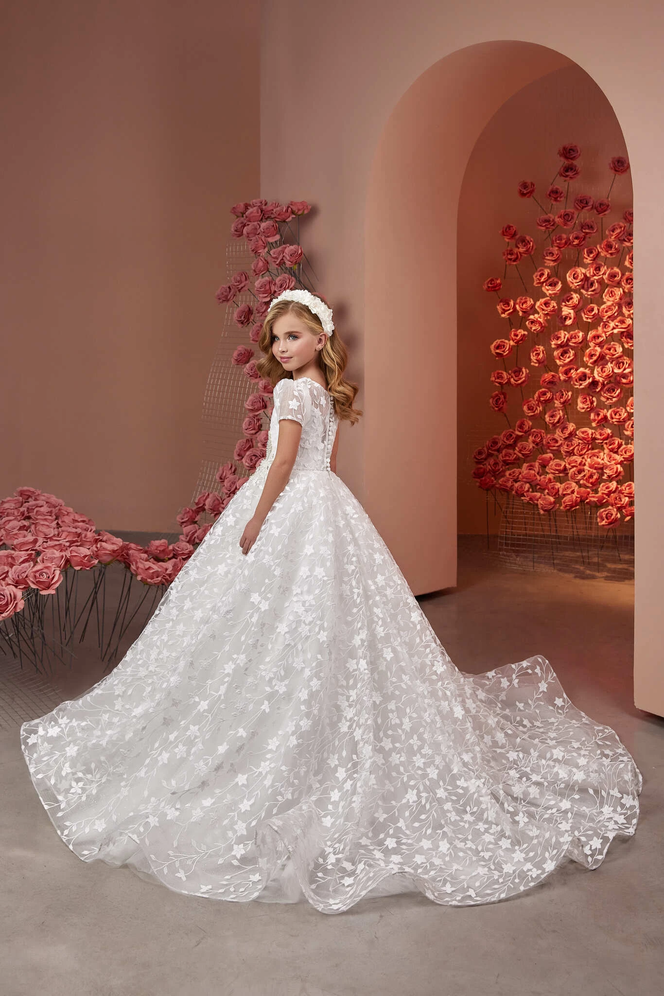 This enchanting little girl’s wedding dress is a perfect example of children’s formal wear, designed to make any young girl feel like a princess on a special day. The dress features a delicate lace overlay that adds a touch of elegance to the full, floor-length skirt, making it a standout piece among special occasion dresses for kids. The A-line silhouette flares gracefully from the waist, creating a timeless and sophisticated look. Short lace sleeves provide a modest yet stylish touch, while the fitted bodice is adorned with intricate floral patterns that cascade beautifully down the skirt. The round neckline complements the overall design, adding to its charm. A long train extends from the back, enhancing the dress’s regal appearance, ideal for formal ceremonies. It’s truly one of the most exquisite kids’ ceremony gowns available