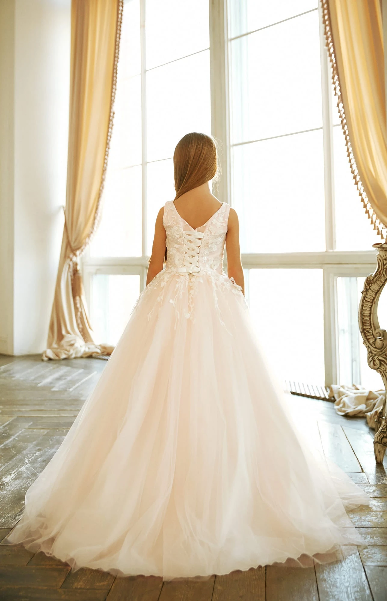 This stunning Tulle and Lace First Communion Dress 1st communion dress is made of soft net over satin lining. It features a jewel neckline and sleeveless tank top, V-cut back, and a full skirt. The bodice is covered with beautiful lace appliques, making the dress so charming. In addition, it has scalloped lace over waistline with sparkling beadings and rhinestones, highlighting the beauty of this communion ball gown.
