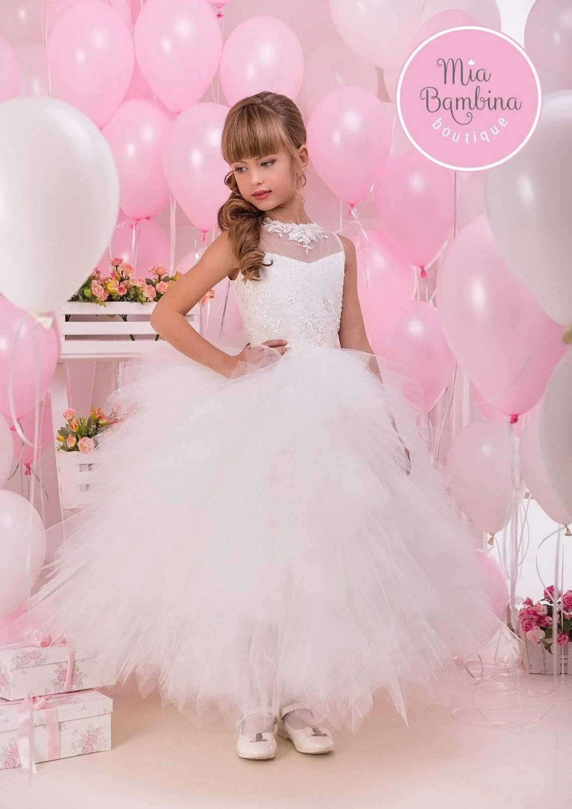 The perfect mini bridesmaid dress with its fluffy tiered skirt and elegant lace embellished neckline. Tank top makes this flower girl dress ideal for any summer wedding or formal occasion. Features a floor-length tutu tulle skirt and lace fitted bodice. Made to order in white, ivory, pink, blush, or champagne.