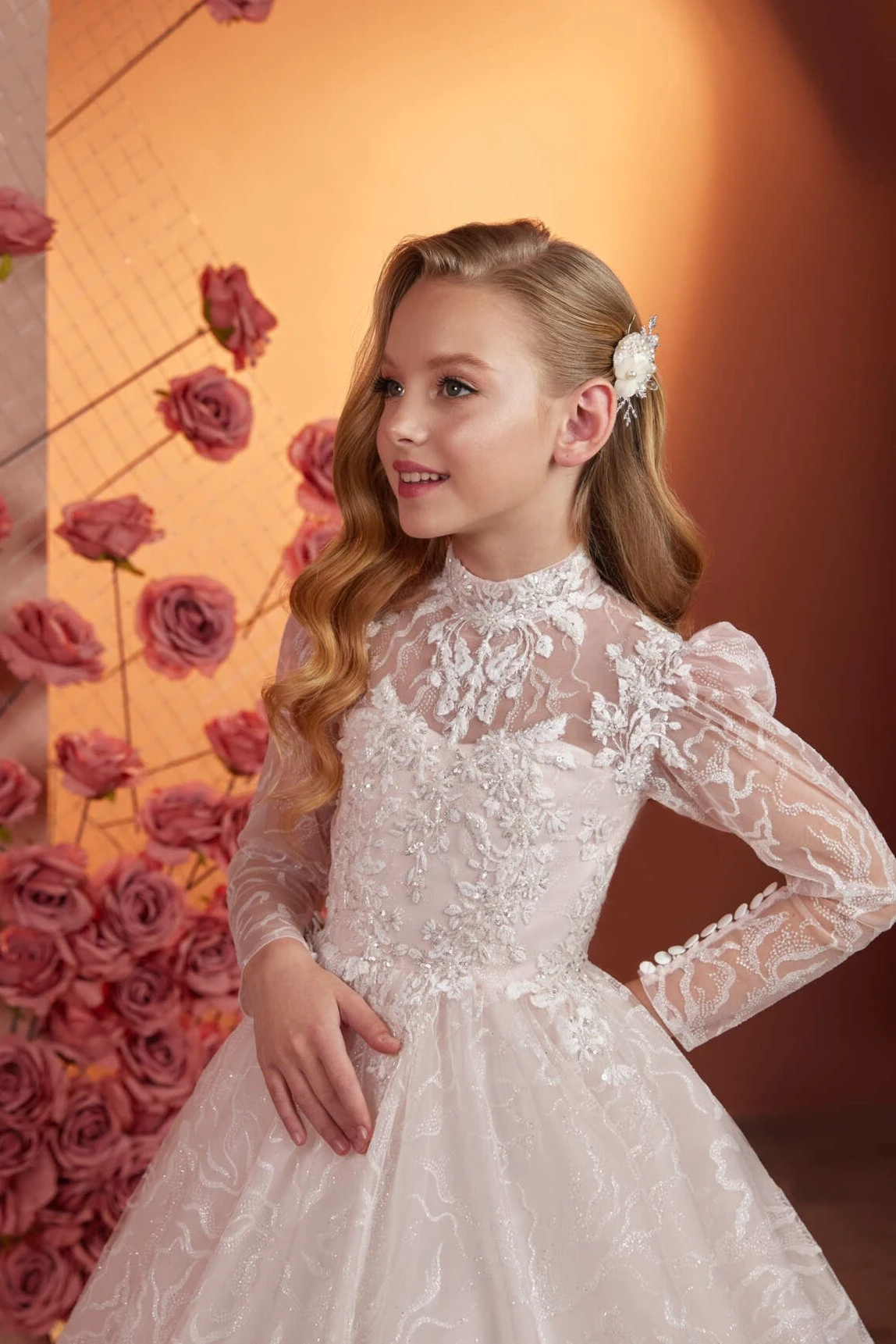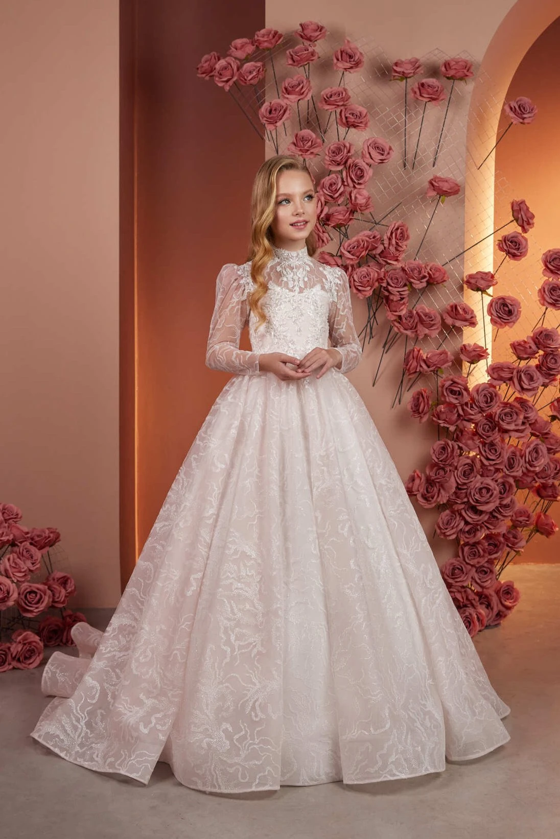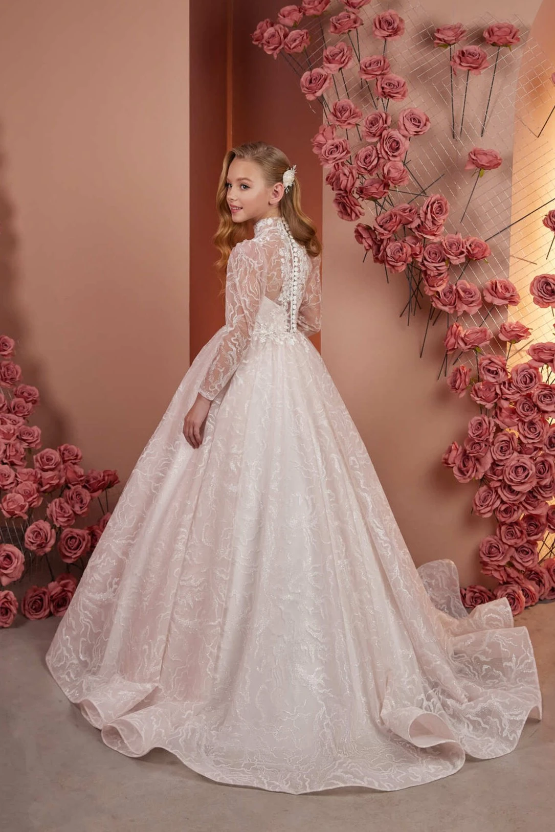 This Enchanted Royal Gown is the epitome of fairy-tale glamour, crafted from exquisite decorative fabric and adorned with magical, intricate details. The corset features a high collar and is lavishly embellished with French lace, intertwined with beads and sparkling stones that capture the light with every movement. The fashionable puffed shoulder sleeves, adorned with elegant summaryed cuffs, add a touch of dramatic flair and sophistication. The long, flowing skirt is enhanced with a wide regline at the hem, which cascades gracefully into a stunning train that exudes regal elegance. The back of the dress is adorned with delicate lacing at the waist and a series of satin summarys, ensuring a perfect fit while adding to the gown’s timeless charm.