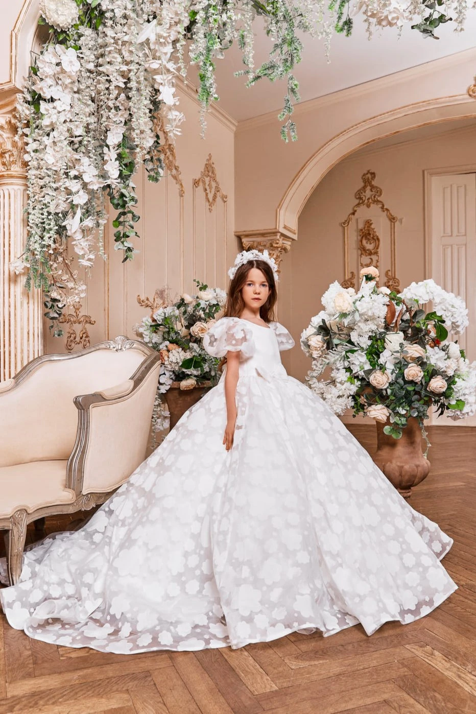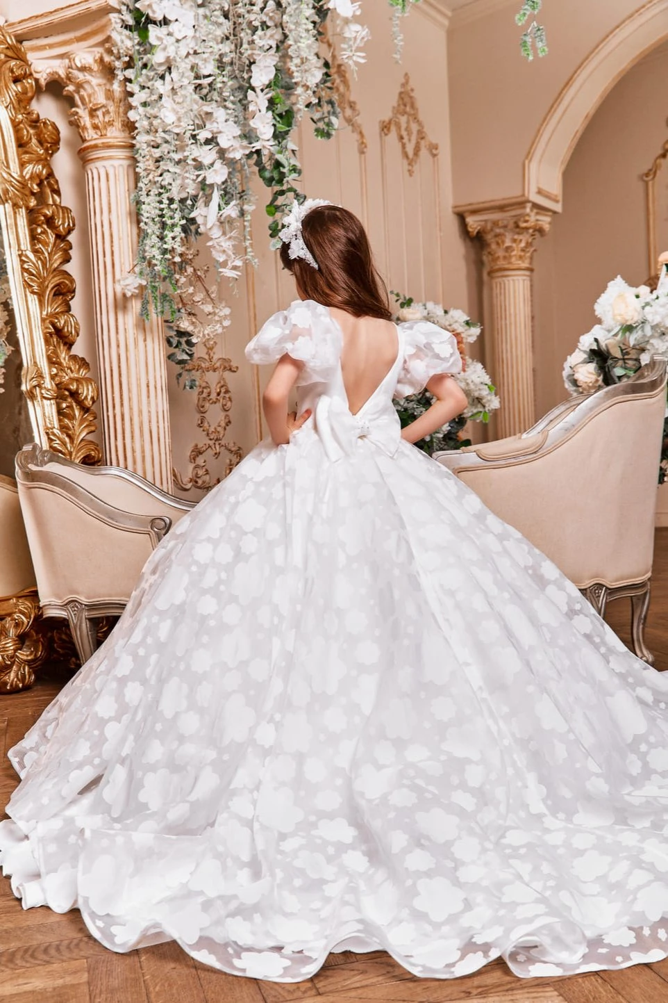 Elegant floral organza dress with bishop sleeves and a stunning V-cut back. Perfect for junior bridesmaids, this dress features a full sun skirt and a charming train. Made with high-quality fabric, it is comfortable and stylish. A must-have for any flower girl’s wardrobe.