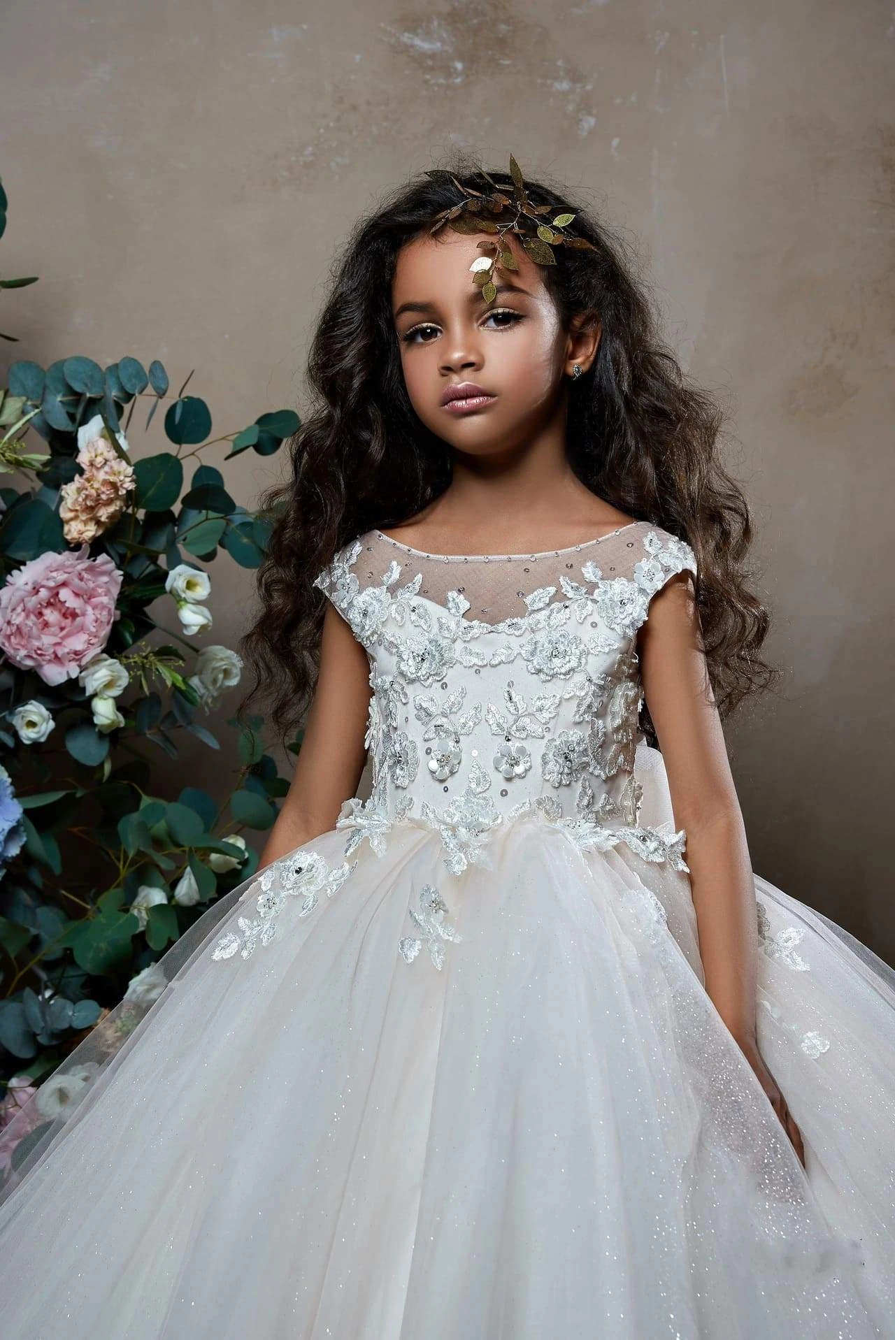 Girls Gerbera Glitter Tulle Princess Flower Girl Dress is designed by Mia Bambina Boutique Canada. This classy and elegant girl’s dress has a ball gown silhouette with an illusion cut-out back. From the lace top with sheer neckline and short sleeves to the softly flowing sweep train, every detail of this flower girl dress evokes a sense of beauty and charm. The lace flowers that frame the bodice also fall onto the top of the skirt, creating a dramatic effect.