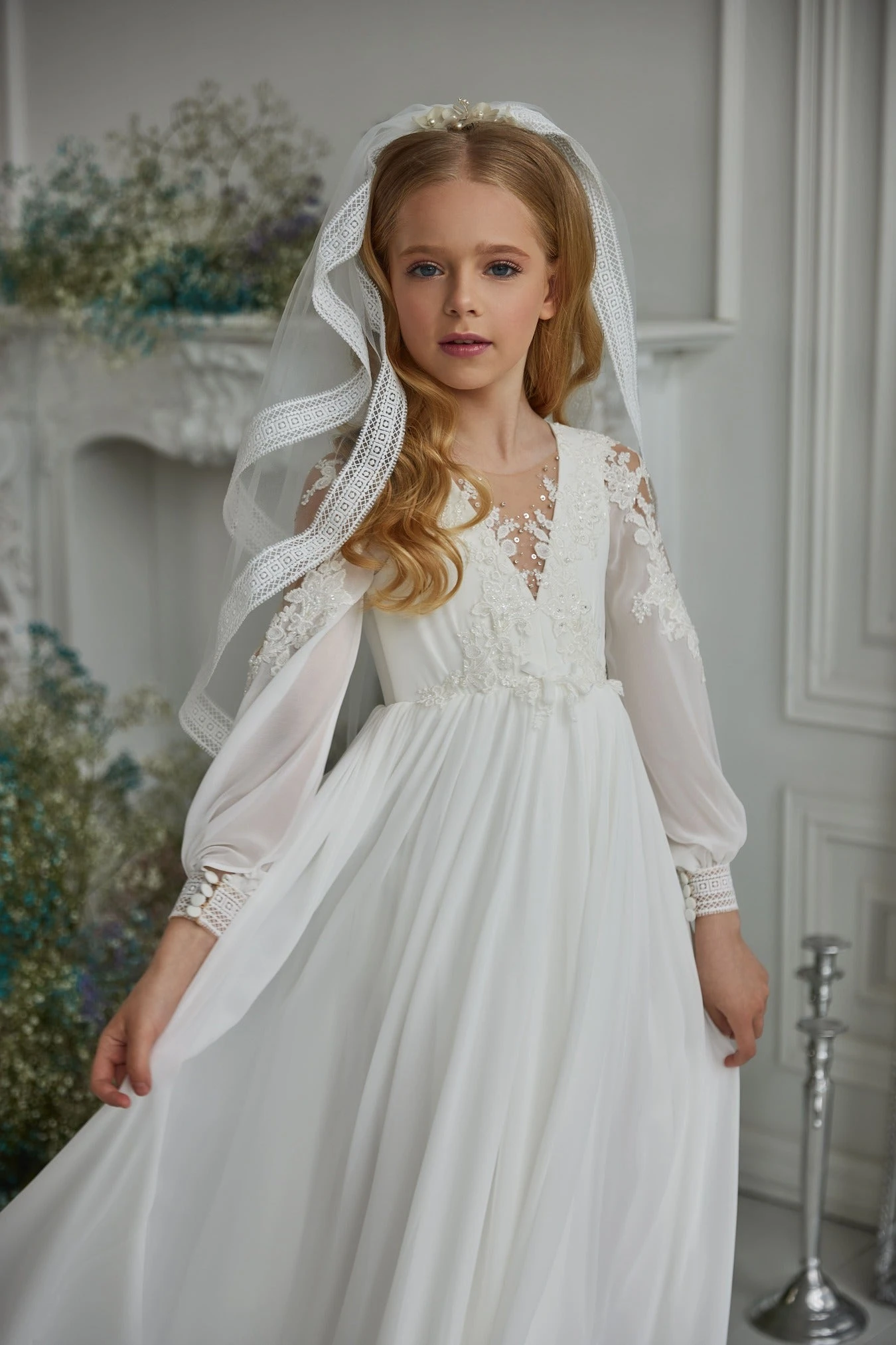 Girls First Communion Dress With Sleeves(Girls First Communion Dress With Sleeves)