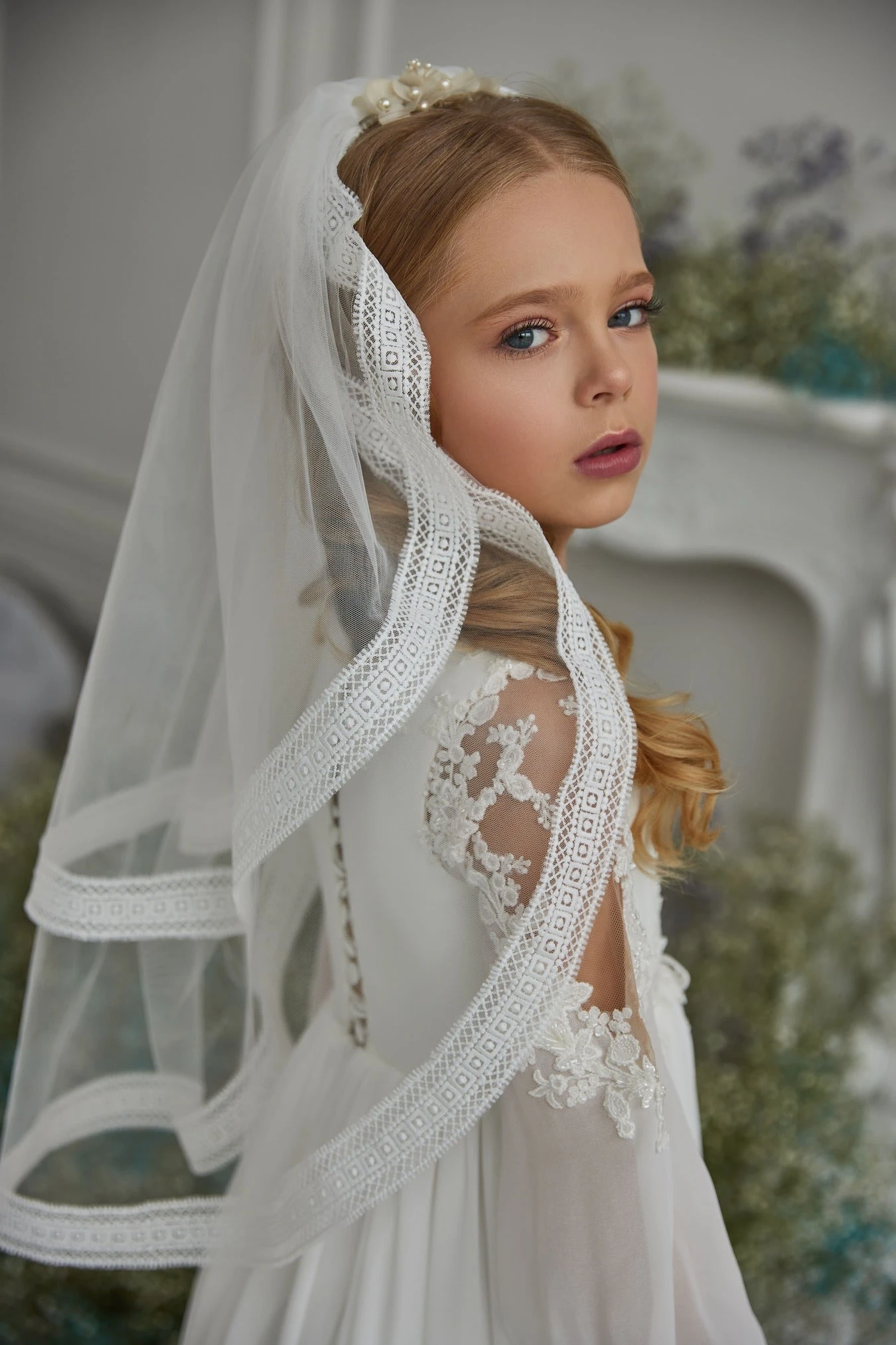 Celebrating the sacrament of First Holy Communion in this unique dress with your family is a blessing. Due to the simple A-line silhouette and refined detailing, this Communion gown looks very graceful. Lace cuffs, ruffled hem, and a summaryed back enhance its charming style. Along with the Communion dress, you can purchase a matching lace-trimmed veil for the ceremony.