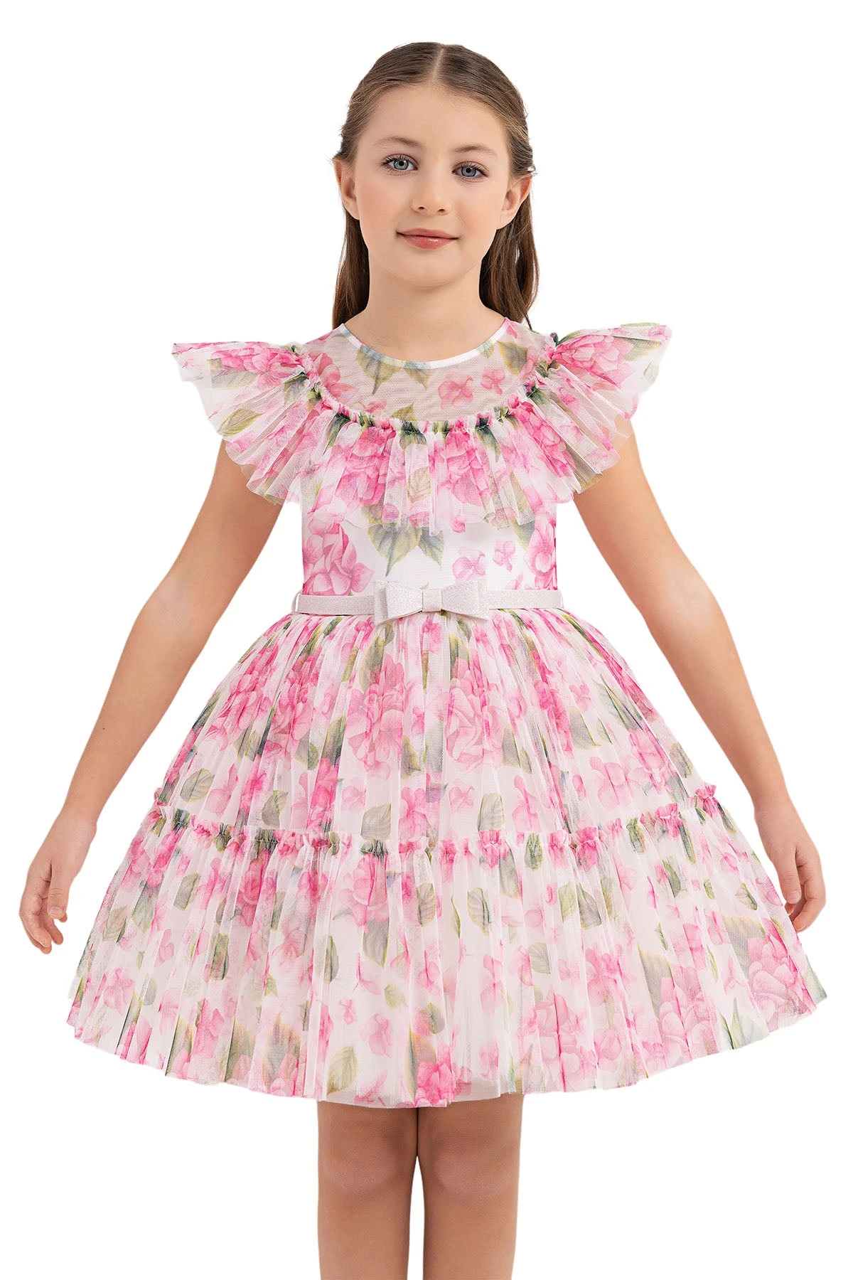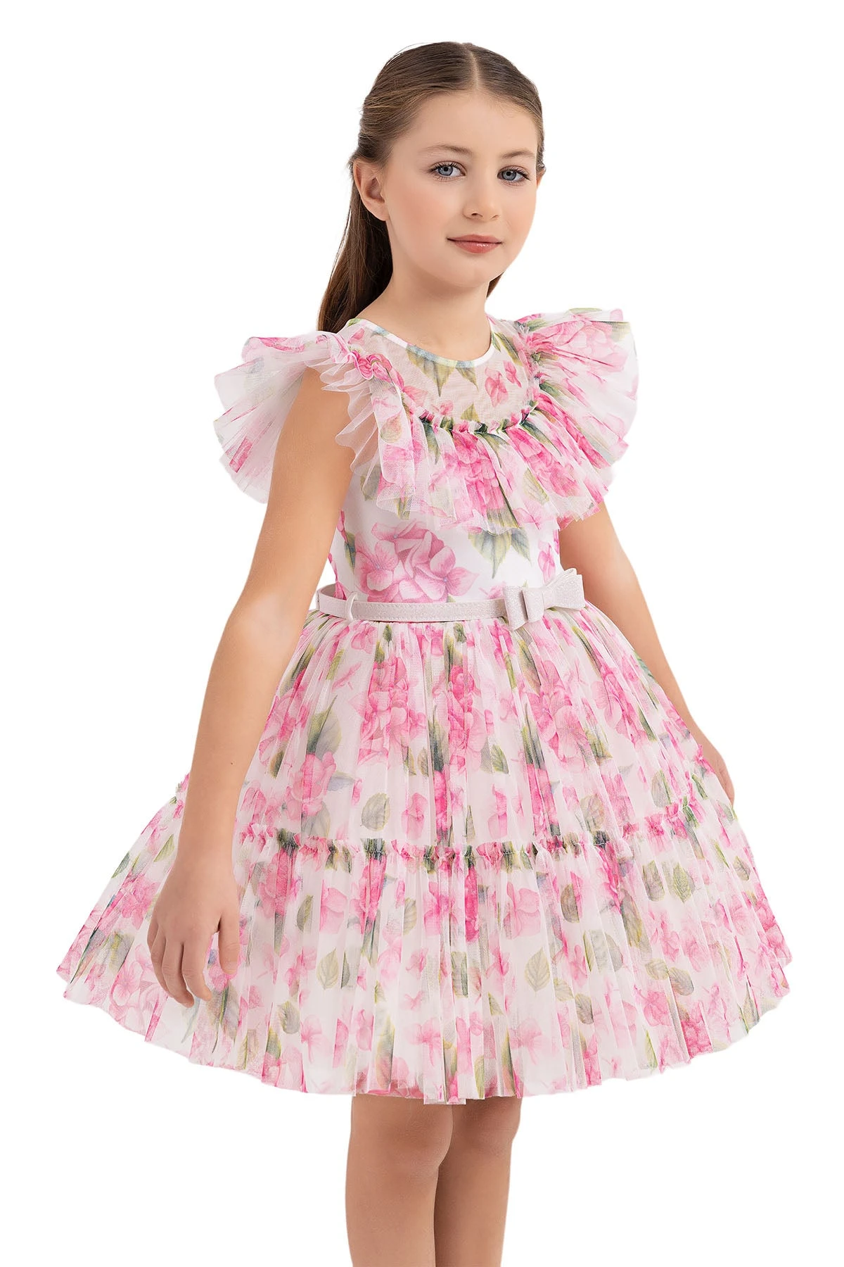 This sweet floral print summer dress is perfect for your little Miss Sunshine! It’s like a spring day turned into an outfit, with its rose and green flowers sprinkled all over. The top of the dress features adorable little ruffles around the neck and shoulders that add just the right amount of frills. The sleeveless top with a round neckline transitions seamlessly into a full, pleated skirt that falls to an above-the-knee length. A lovely floral motif enhances the dress’s charm, complemented by a silvery belt with a bow at the front, adding a hint of shine. Its cotton lining is soft and comfortable. The colors and design suggest that this dress could be a lovely choice for various occasions, such as a garden party, an Easter celebration, or a festive springtime event. Whether she’s on an Easter egg hunt, blowing out birthday candles, posing for pictures, or twirling at a wedding, she’ll look as sweet as pie and ready for fun. It’s the go-to dress for making those heart-melting memories!