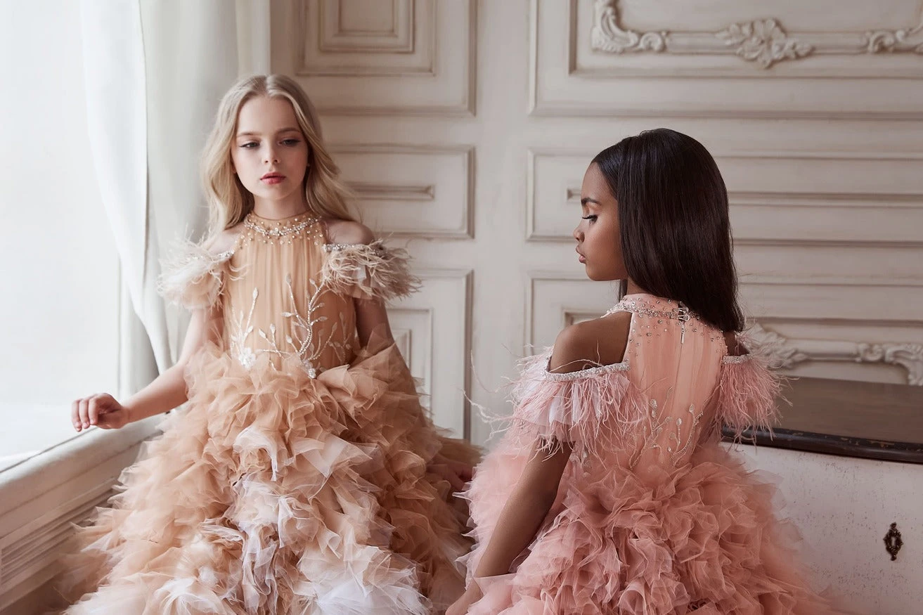 Girls long fluffy tulle dress by Mia Bambina Boutique Canada. This unique couture gown is an absolutely stunning dress for flower girls, fashion shows, prom, or red carpet ceremonies. It features a halter neck bodice with cold shoulders decorated with tulle ruffles and ostrich feathers. Sparkling pearls and crystal beading adorn the bodice all over. The voluminous long skirt, made of two-tone tulle, has multiple handkerchief tiers of ruffles.
