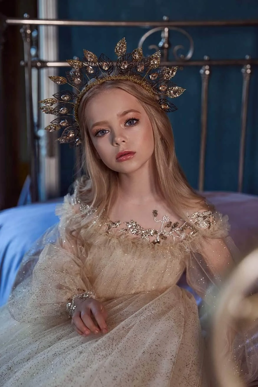 This lovely long tulle dress for girls by Mia Bambina Boutique Canada is available in blush/pink shades as well as white, ivory, or cappuccino. She will undoubtedly feel like a true princess in this exquisite ball gown featuring an illusion off-the-shoulder neckline and long sheer sleeves, which are gathered at cuffs. Exquisite lace-work, rhinestones, and frills frame the shoulder line. The softly pleated corset bodice is contoured by tiny beading along the waistline. 3112 long tulle dress is a long puffy ball gown made of yards of light tulle with a hint of shimmer.