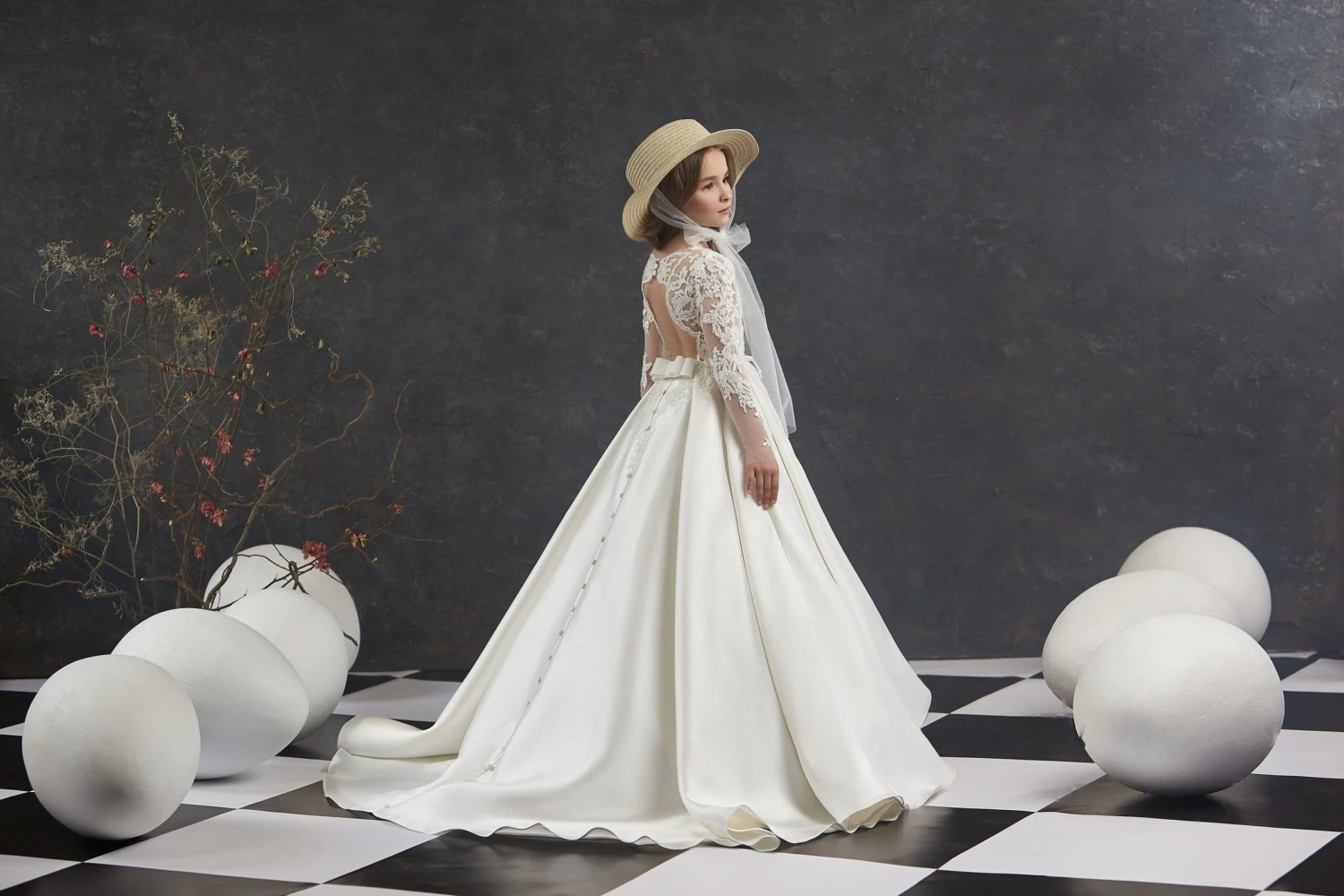 Your little princess will look just darling walking down the aisle in this dress. This is a classic ball gown with a modern twist. It features long lace sleeves, lace appliques on the top, and a spectacular open back. The voluminous multi-layered skirt in satin turns into a short elegant train.