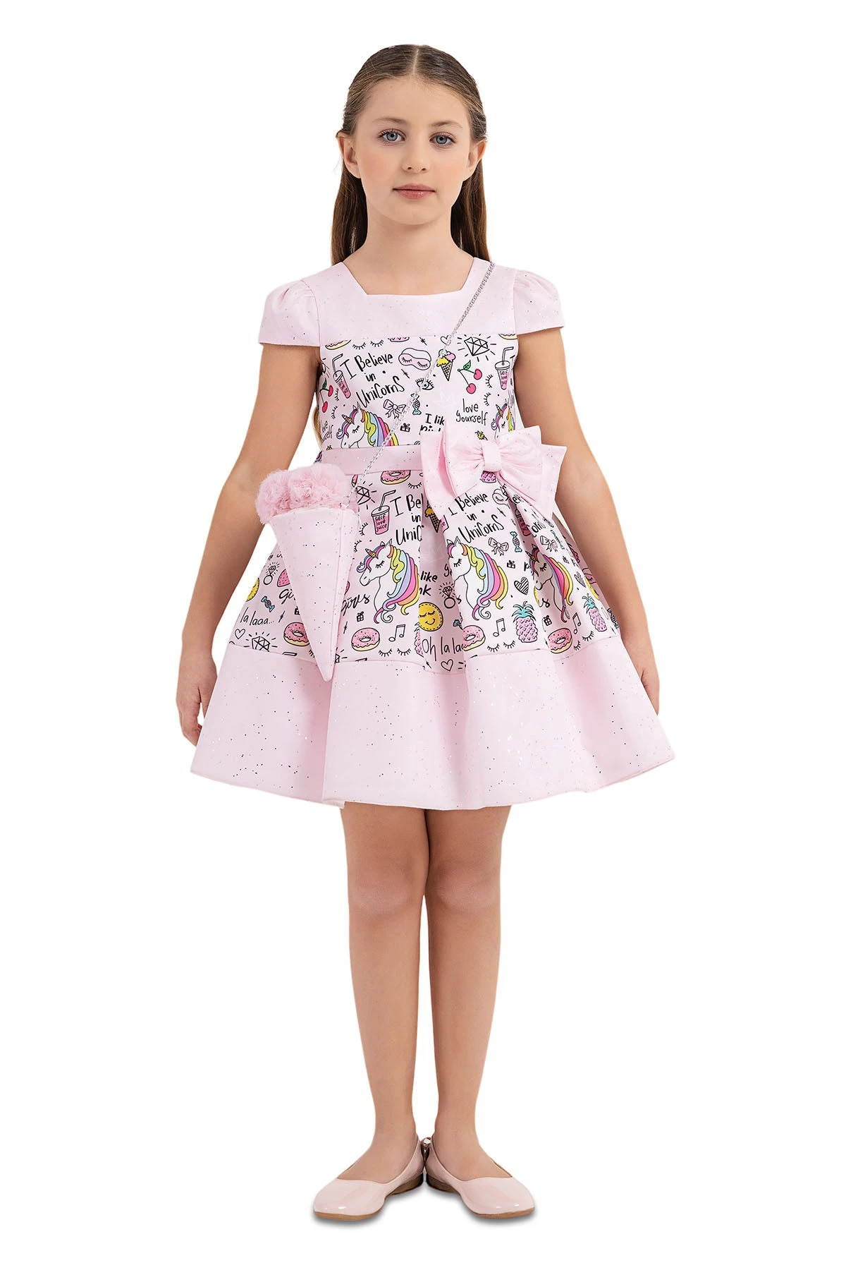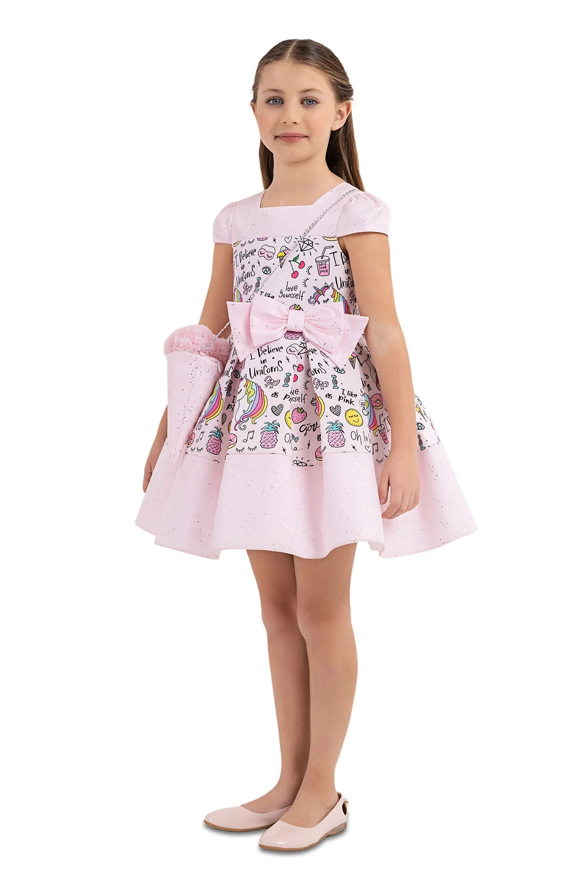 The fun and fashionable Unicorn-print dress for girls is a sweet confection. It comes in pink and is sprinkled with sparkling glitter. The yoke, sleeves, and waistband are decorated with glitter and finished with a large double bow. Additionally, the skirt’s hem is decorated with a touch of sparkle that adds an enchanting twinkle to every movement. The heart of the dress is its whimsical print, which features playful unicorns, rainbows, and joyful affirmations. The coordinating purse comes in pink, has a cone shape, and is trimmed with fluffy pink accents. This joyful and colorful ensemble is perfect for any little dreamer’s fantasy-filled summer adventures. This dress could be a lovely choice for a garden party or a festive summer event.