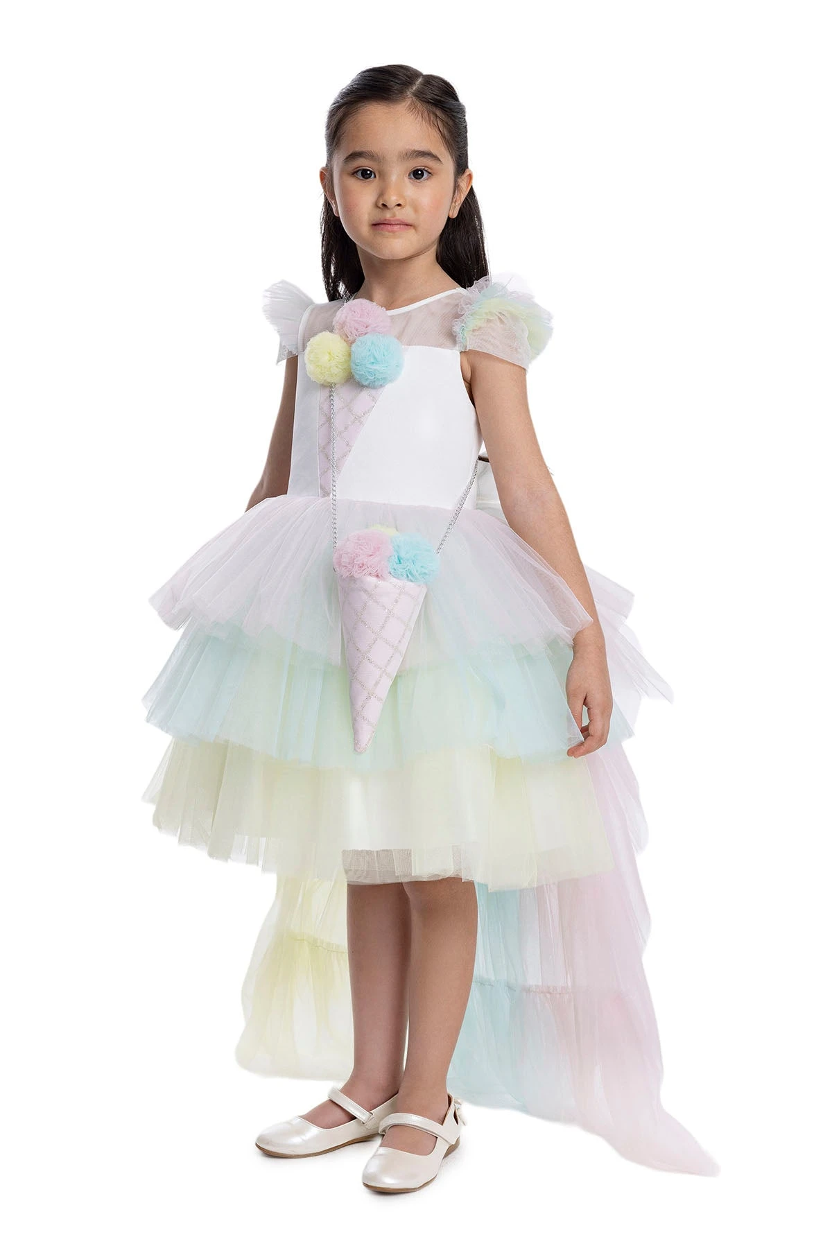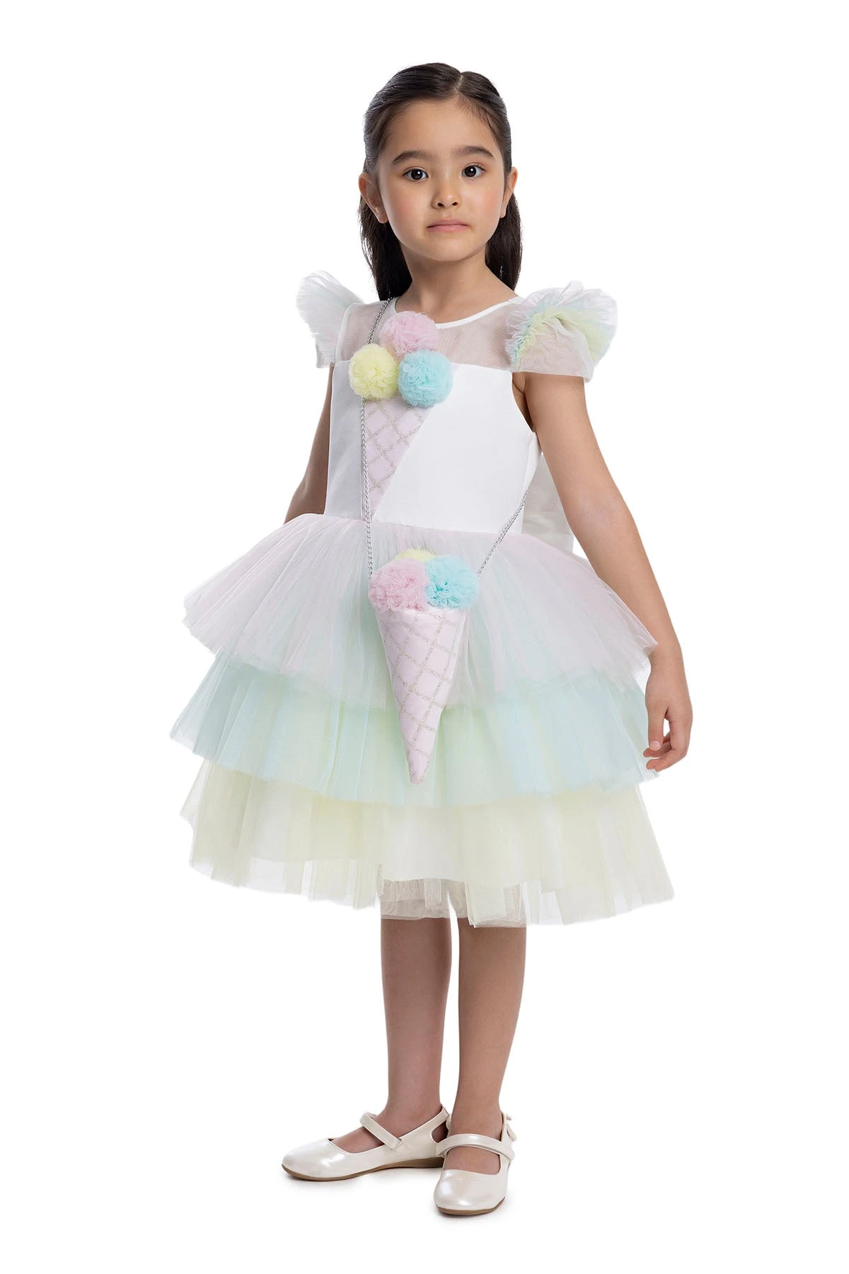What’s more, the dress comes with a handbag on the chain shaped like an ice cream cone. The three multicolored ruffle pompoms decorate the kid’s purse, making it the perfect accessory to complete the outfit. With so many adorable details, this dress will be the star piece of wardrobes this season. It is a standout choice for special occasions and a perfect birthday or party dress.