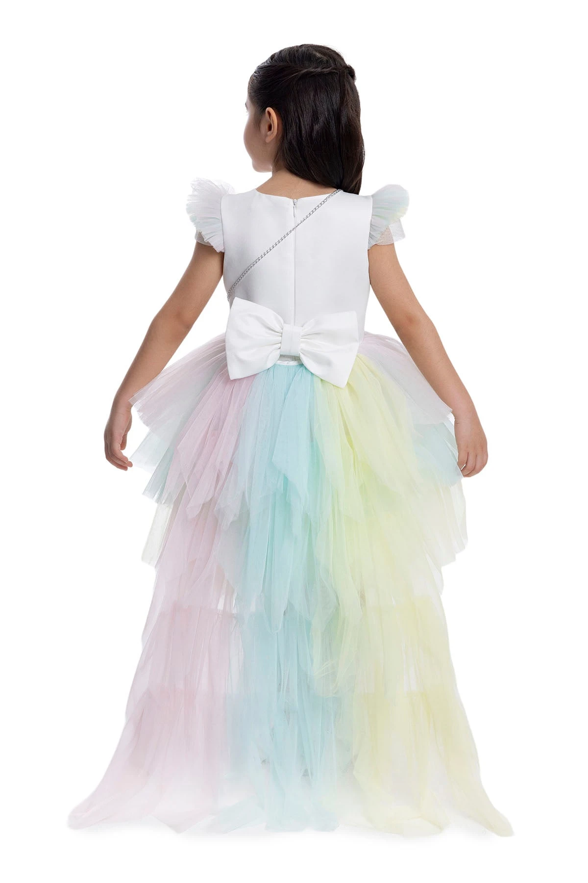 This multicolored tutu dress with a long tail might be a perfect addition to your little girl’s unicorn-themed birthday party! The dress features short sleeves, a crew-neck collar, and ruffle details that give it a unique look. The bodice has a transparent tulle yoke and a ruffled pompom ice cream detail, making it a heart-stealer for little girls. The knee-length skirt has multicolored tulle sectors, giving it a voluminous shape. Plus, it has a longer detachable tail at the back, making it even more special. The dress has a zipper closure at the back, and a large satin bow completes the look. The cotton lining inside ensures health and comfort for children.