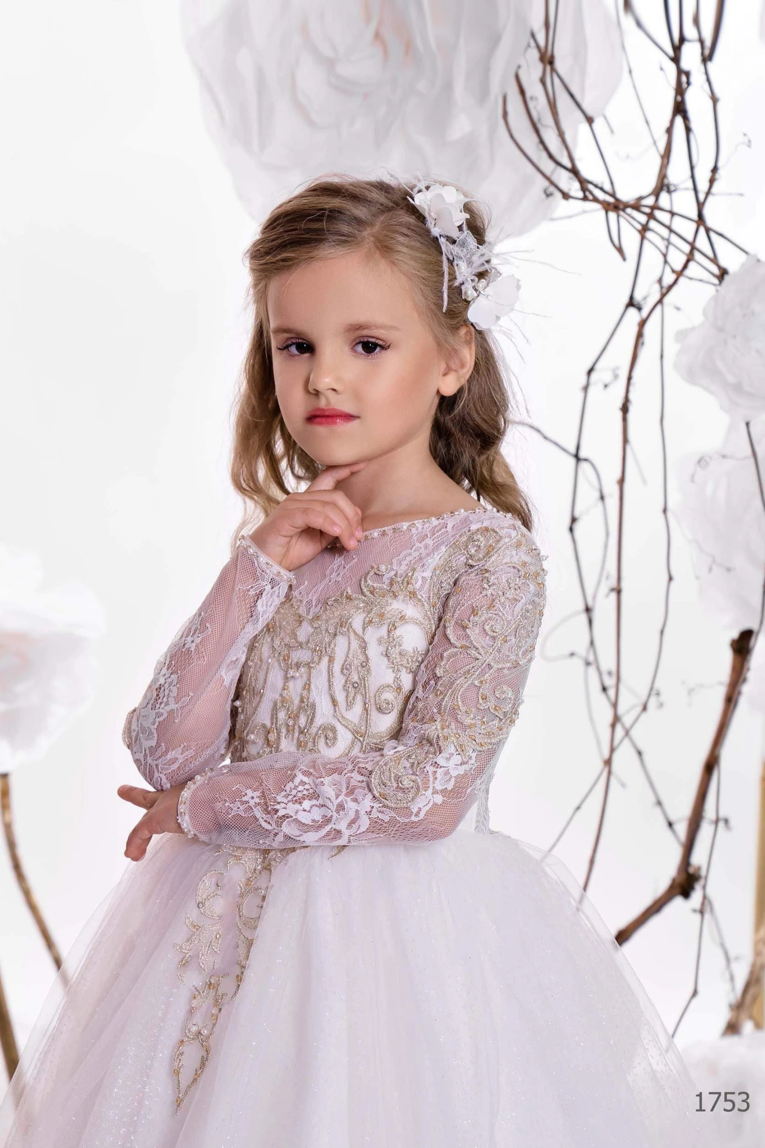 Girls sparkly and soft lace dress for weddings or Communions by Mia Bambina Boutique Canada. This classy and elegantΒ dressΒ has a ball gown silhouette with an illusion cut-out back. From the lace top with sheer neckline. to the softly flowing sweep train, every detail of this girl’s gown evokes a sense of beauty and charm. The lace 3D flowers that frameΒ the bodice also fall onto the top of the skirt creating a dramatic effect. The white dress has matching white lace.