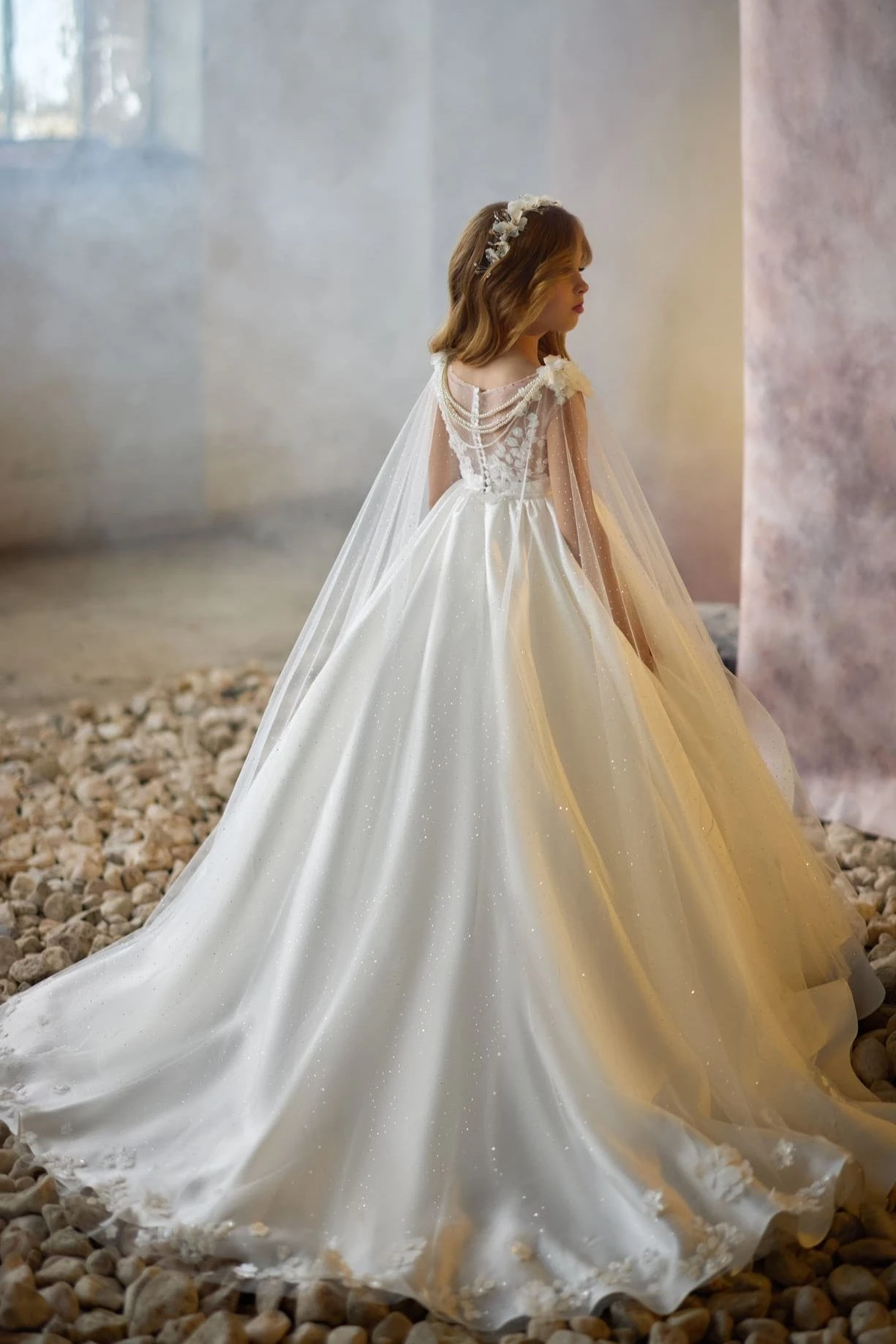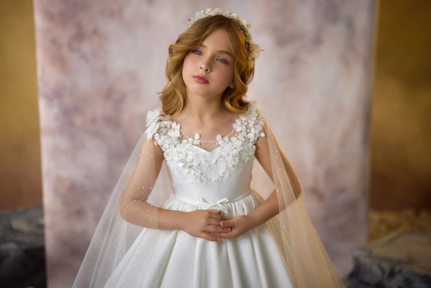 The gownβs wide, matte satin skirt flows gracefully, with floral adornments tracing the hem, and a summary-back closure is accented with beaded pearl detailing, completing the look with a nod to tradition and timeless elegance. This gown is a true symbol of her journey in faith and the joy of her First Communion.