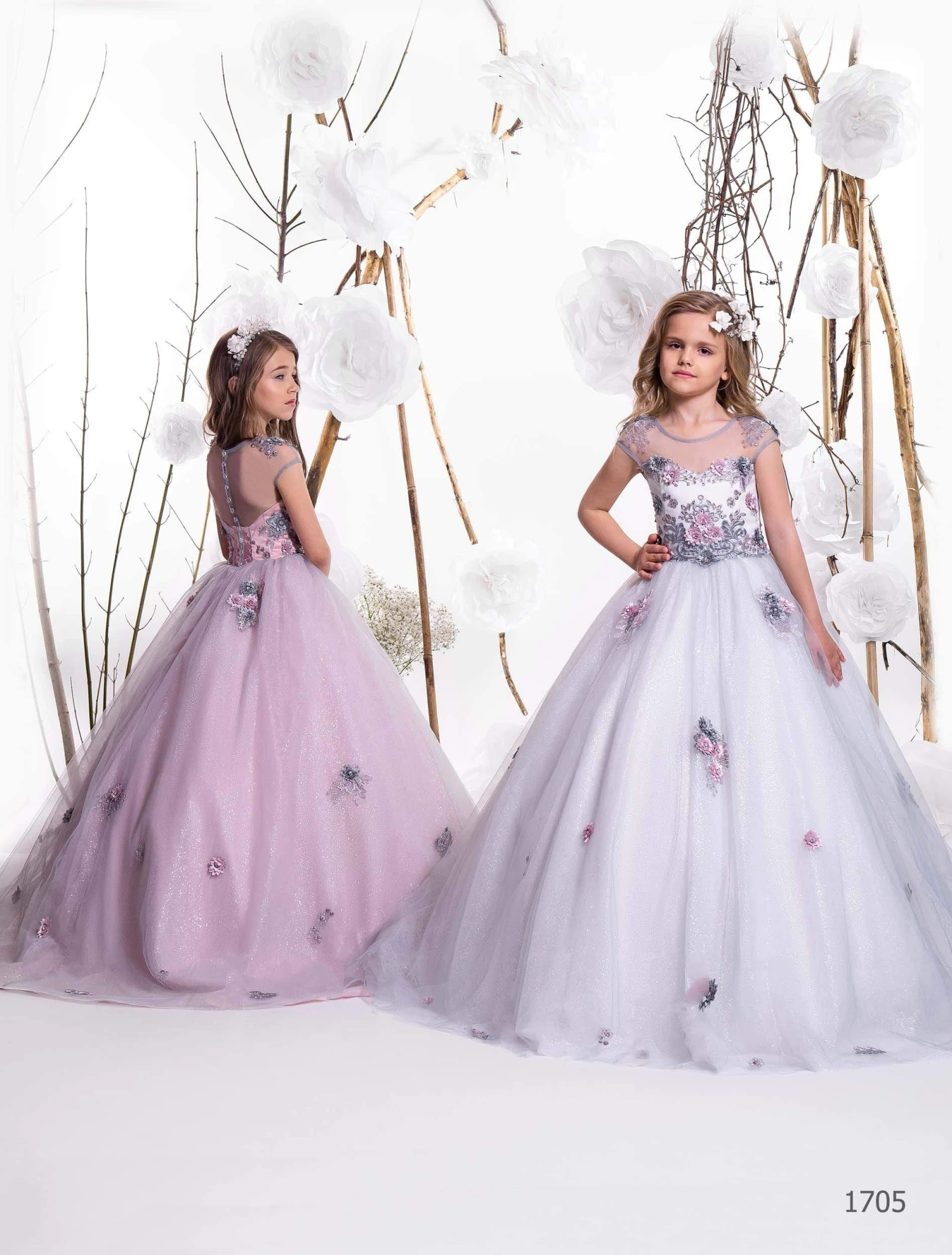 Girls dusty blue/silver dress for weddings by Mia Bambina Boutique Canada. This classy and elegant dress has a ball gown silhouette with an illusion cut-out back. From the lace top with sheer neckline. to the softly flowing sweep train, every detail of this girl’s gown evokes a sense of beauty and charm. The lace 3D flowers that frame the bodice also fall onto the top of the skirt creating a dramatic effect.Â