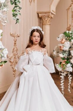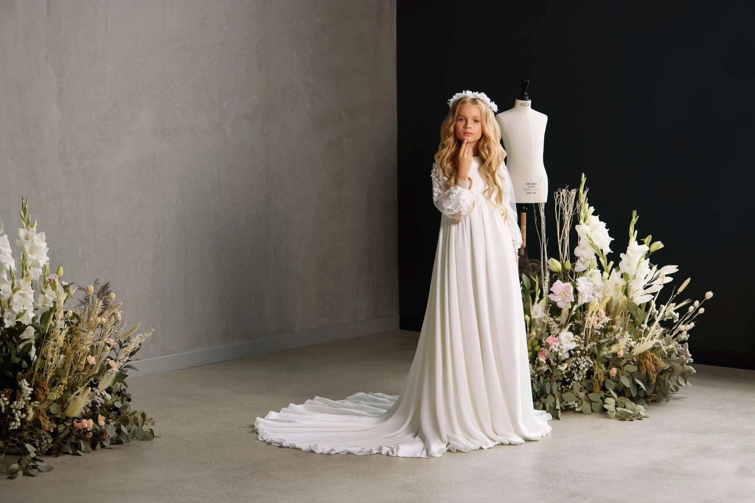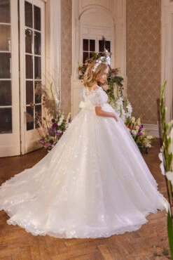 HAMILTON- CHIFFON LONG TRAIN COMMUNION DRESS WITH SHEER FLORAL SLEEVES