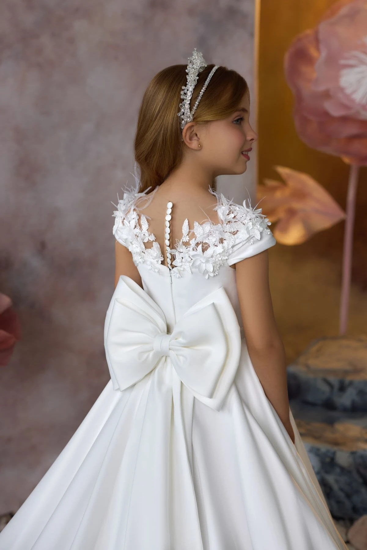 The Heavenly Petals Communion Gown is a divine creation, designed to reflect the purity and reverence of her sacred day with the Lord. This elegant communion dress features delicate feathered floral adornments along the scalloped collar, adding a heavenly touch to the design. A tiny bow at the waist offers a subtle accent, while the oversized double bow at the back creates a statement of grace and beauty. With a mix of zipper and summary closure, the gown ensures a perfect fit as it flows into a long, stunning train—worthy of the solemnity and joy of her First Communion.