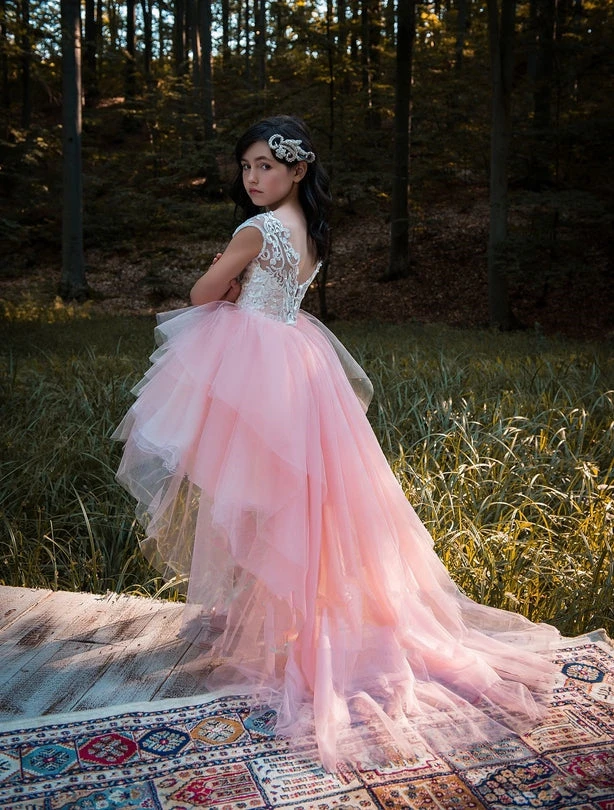 The Hollywood flower girl dress is a stylish high-low dress for her next special event. The high-low tulle tutu skirt provides a party look on the front and a long formal look at the back, making this versatile sleeveless dress perfect for semi-formal events. Illusion lace creates a stylish neckline and frames the open back.