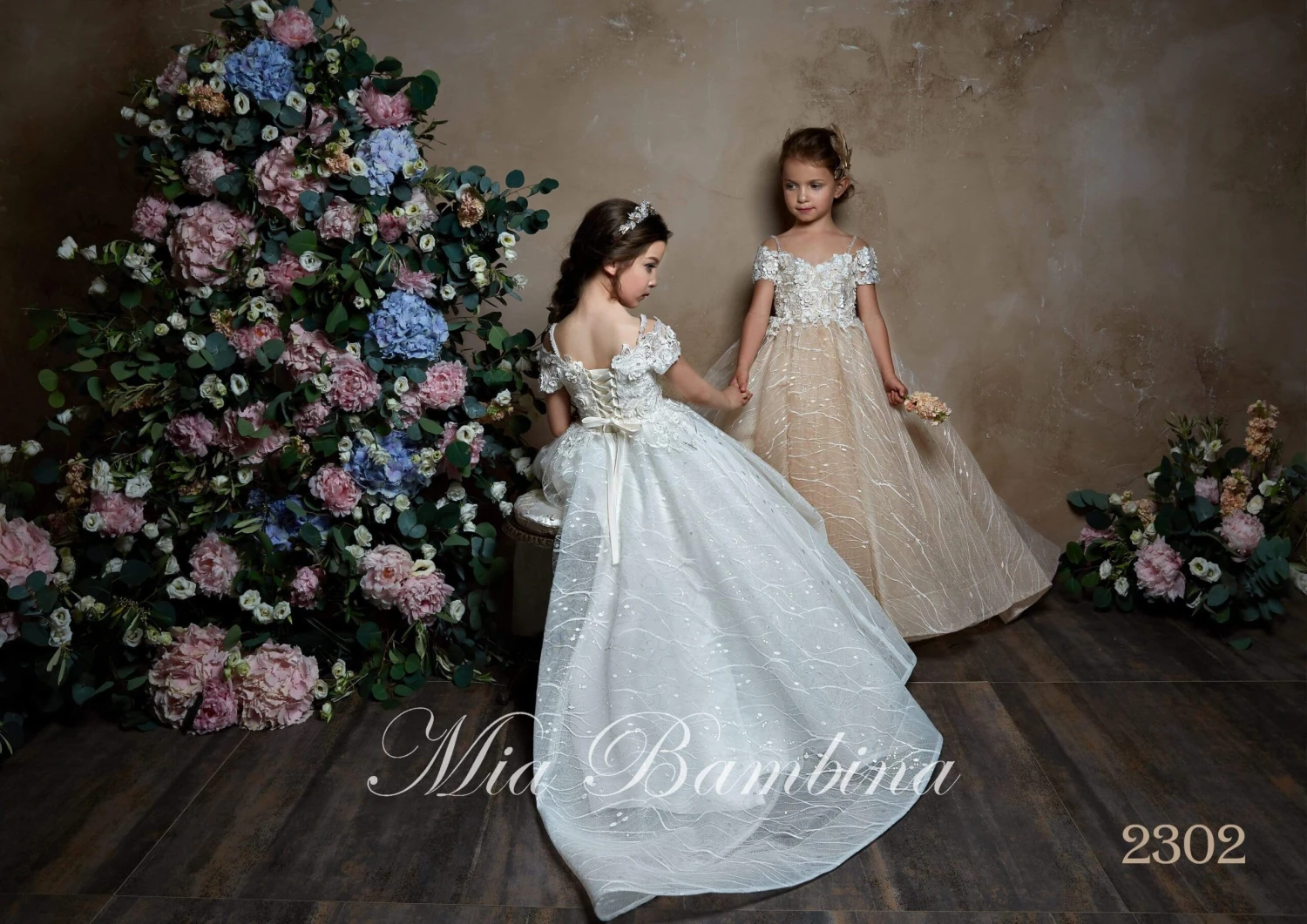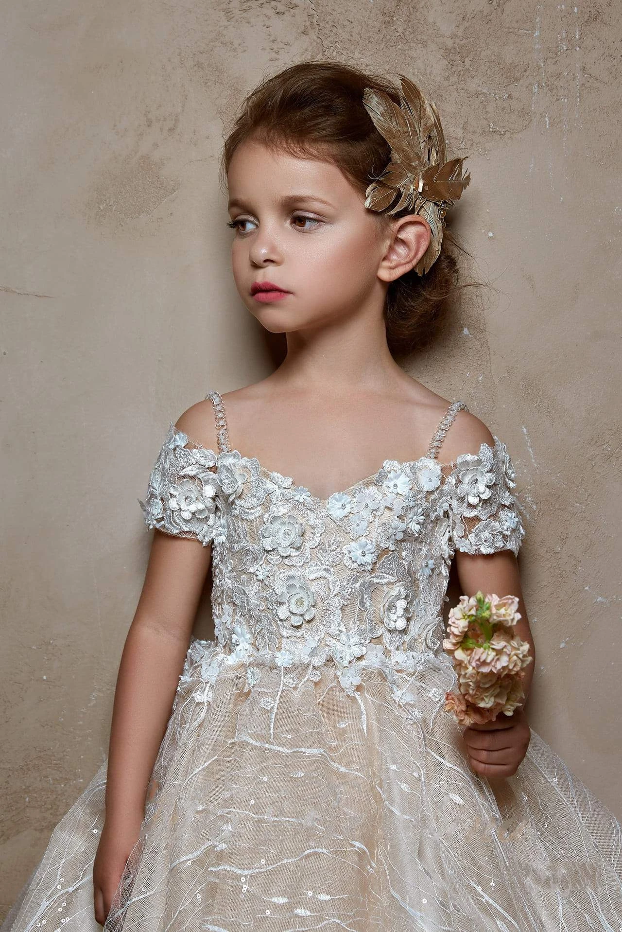 The Off-the-Shoulder Flower Girl Dress with an Intricate Floral Design.Β Make a sweeping entrance in this stunning ball gown with embroidered spaghetti straps, off-the-shoulder sleeves, and an open back. The delicate floral lace appliques adornΒ the bodice, while a floor-length full skirt extends into an elegant train and complements the incredibleΒ look. This pretty toddler or girls dress is a perfect flower girl dress available in white, ivory or cappuccino.