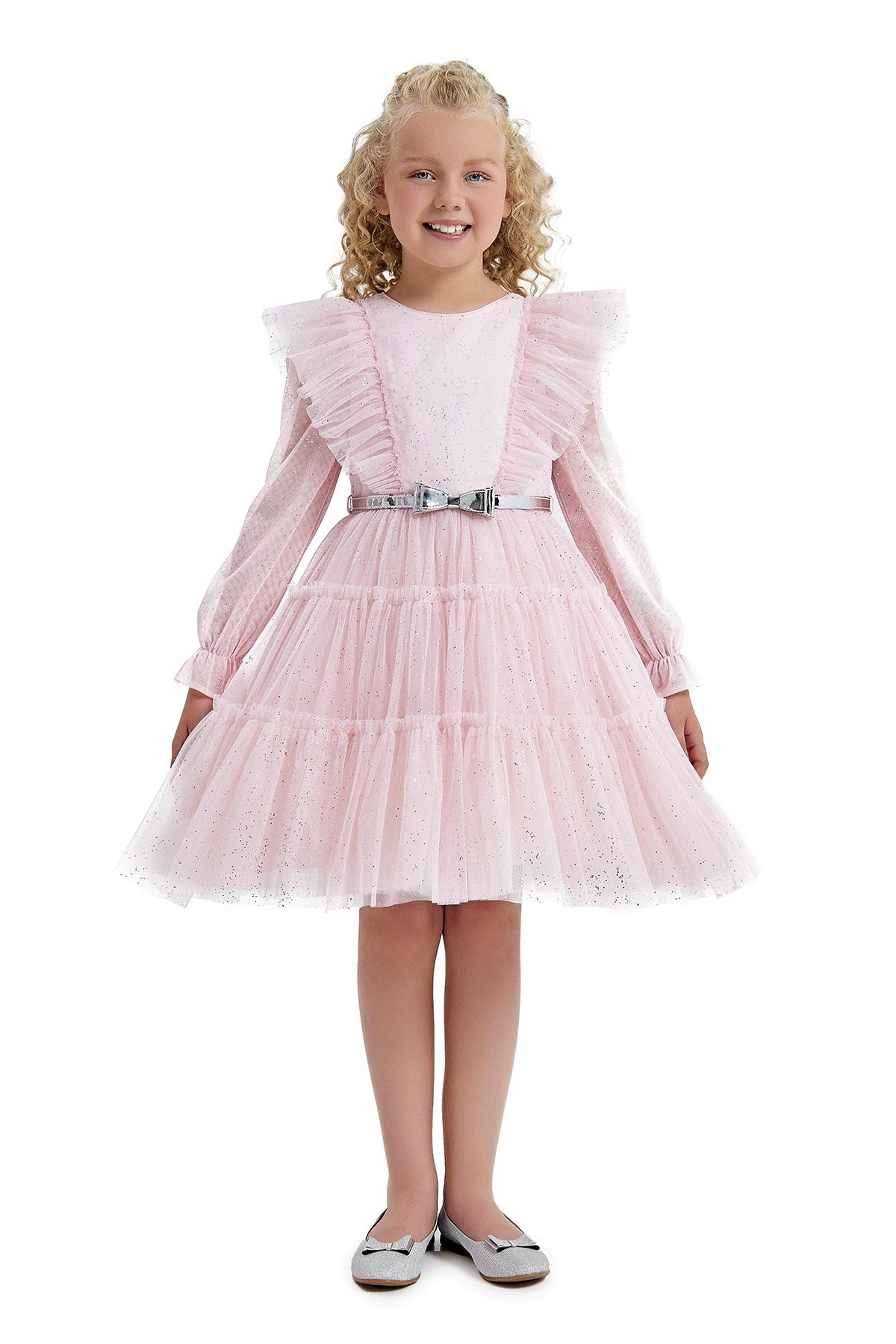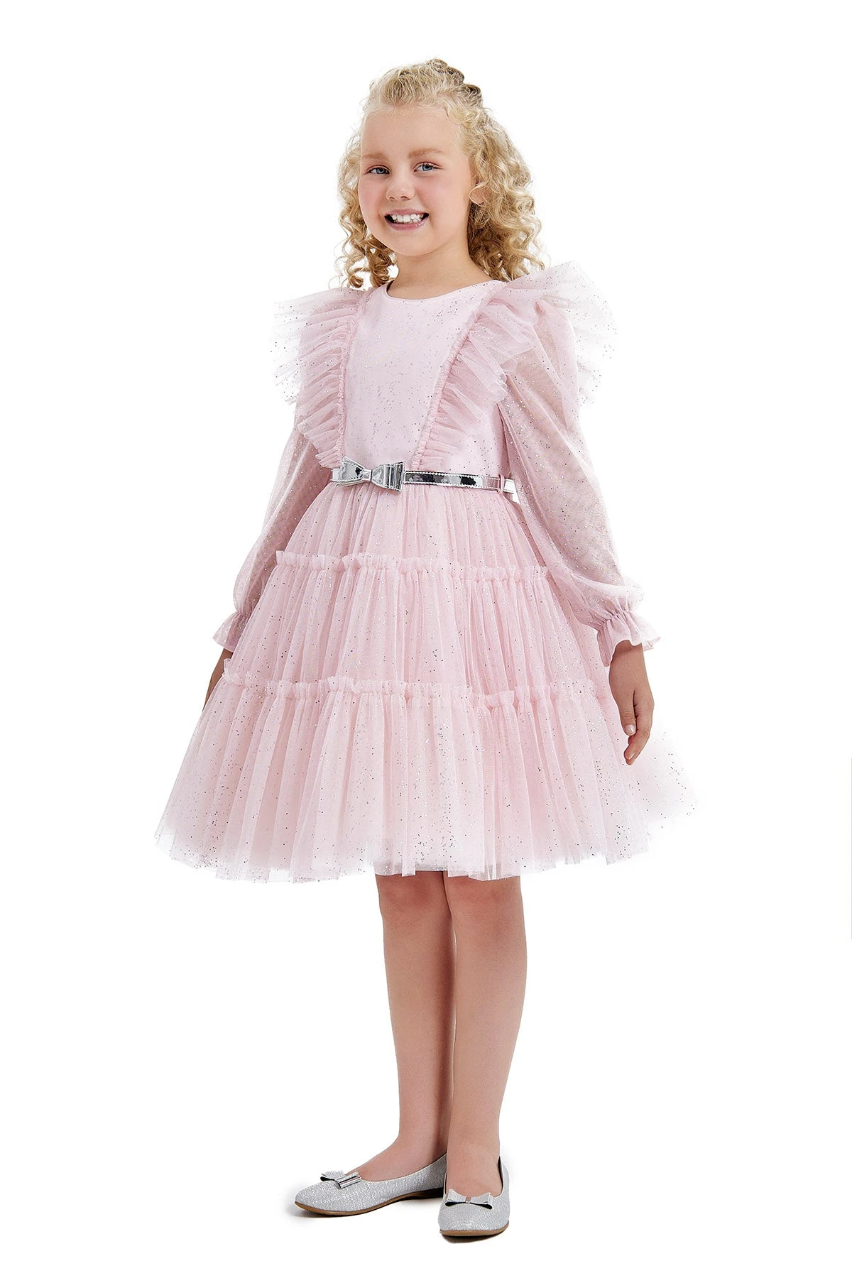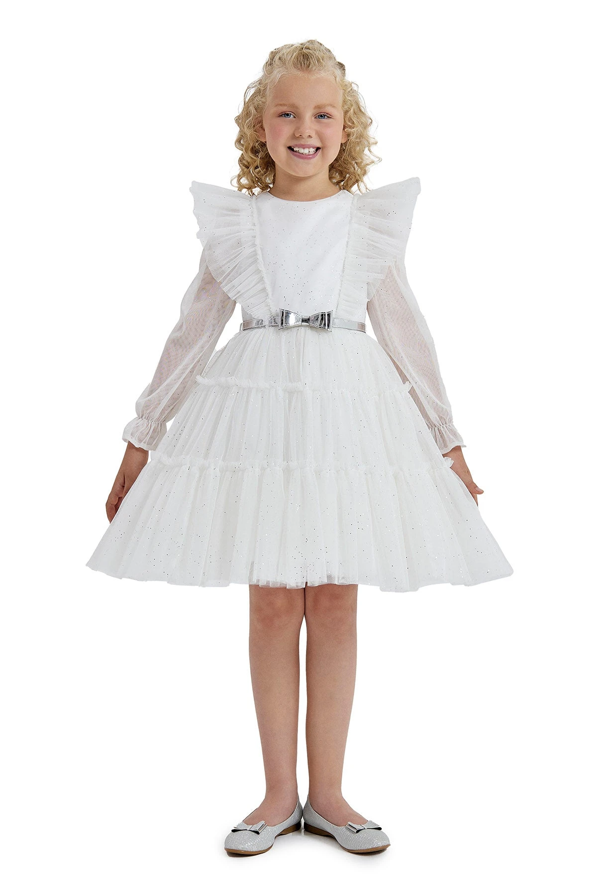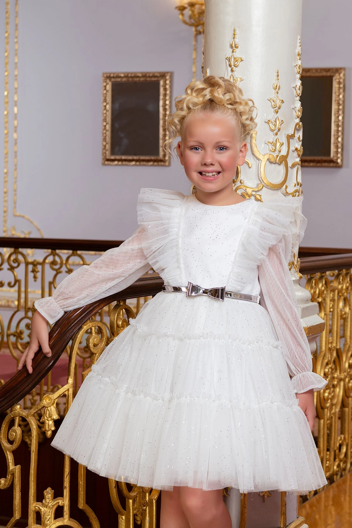 This show-stopping garment features a glitter tulle and cotton lining of ivory shade, ideal for 8 to 12-year-olds attending special occasions. An eye-catching silver bow belt adorns the waist of the dress, making it perfect for confirmations, weddings, and other celebratory events. Your teen girl will look elegant and radiant at any special occasion with this beautiful dress.
