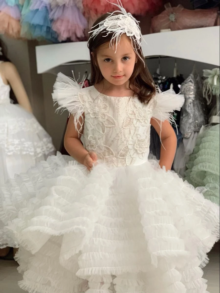 Β Kayla Ruffled Dress for Girl is a pretty girl’s dress with a knee length skirt. The classic lace embroidery top with little cup sleeves is embellished with ostrich feathers. Perfect for weddings and birthdays. Kayla flower girl dress fits girls sizes from 5T to 12. It is fully lined with soft cotton fabric. This gown will make your little princess look elegant at any party or special occasion. Available in Ivory color.