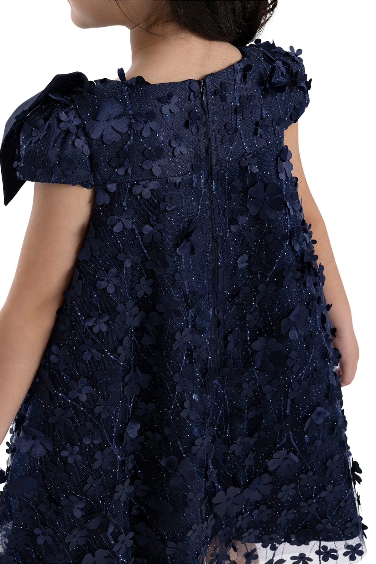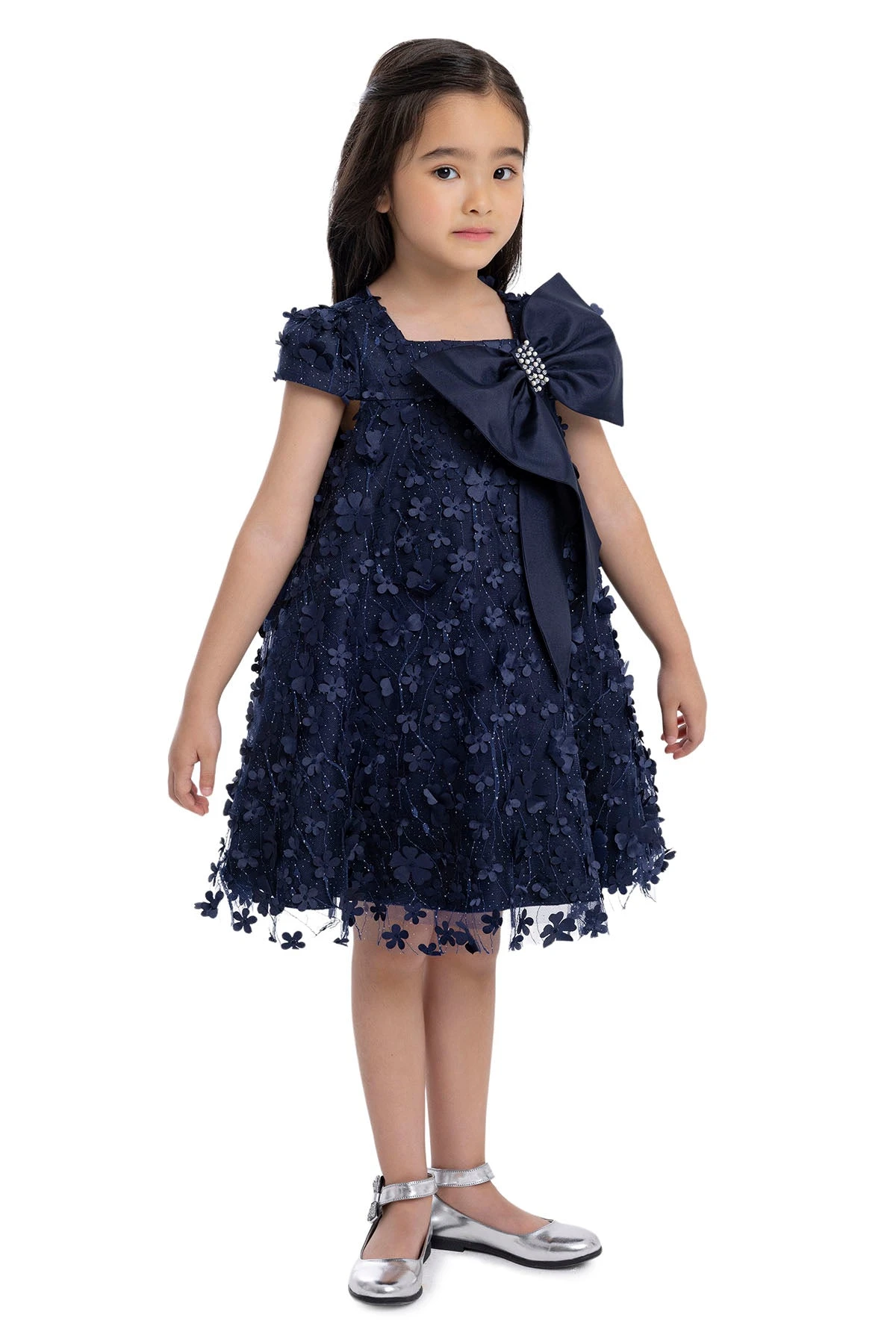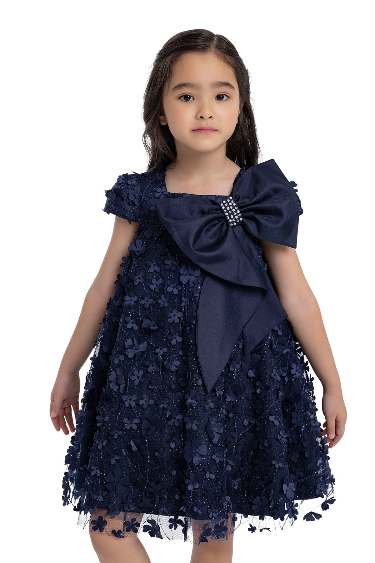 This little girl’s navy blue party dress is an enchanting choice for your little one’s special events. Three-dimensional flowers are tastefully scattered across the mesh overlay, creating a voluminous trapeze silhouette. It’s further adorned with a glimmer of rhinestones on the large satin bow. The dress flares gracefully from the waist, suiting various body types and allowing children to move comfortably. With an underlay of soft satin and a cozy cotton lining, it promises comfort against the skin. This dress is a splendid pick for formal occasions, holiday celebrations, music recitals, or as a unique option for a wedding. Its thoughtful fabric selection and child-friendly silhouette are designed with your child’s comfort in mind.