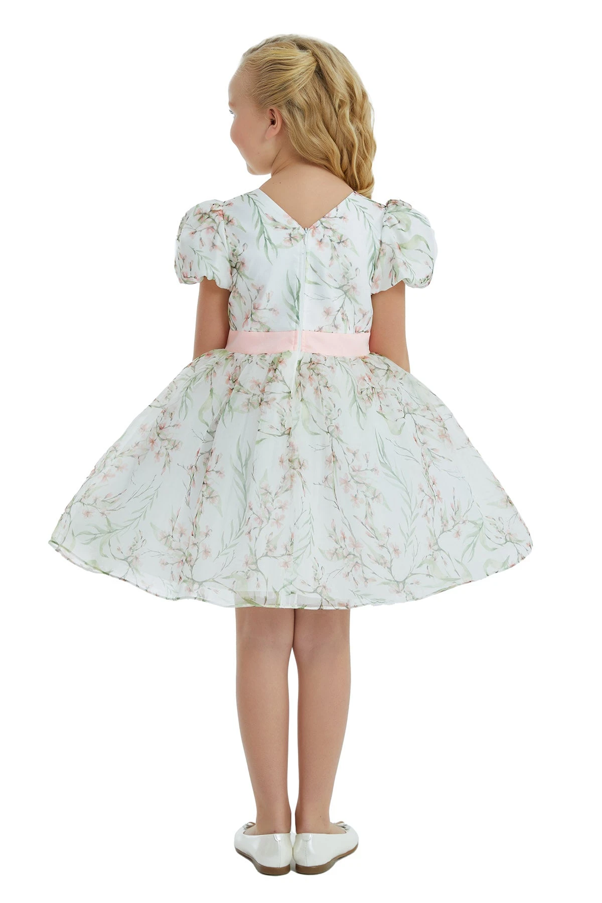 Shop Easter Dress for Girls at Mia Bambina Boutique, Canada. Kids floral spring and summer dress in tulle features floral prints on lightweight fabric. It is the perfect look for Easter, birthday party, spring, and any special occasion, or wedding. It features a round neck, short sleeves, and a contrasting pink bow decor at the waist. Your little one will look lovely and and feel comfortable! Perfect for flower girls, pageants, birthdays, and other special occasions. Its slightly gathered full skirt has layers of stiff tulle underneath. It fastens with concealed zip at the back.