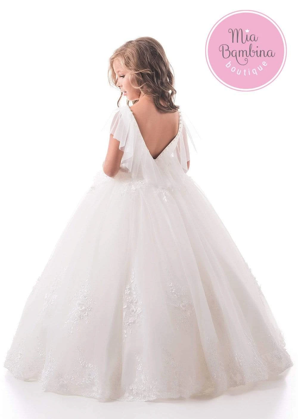 A stylish off-white V-cut back girl’s dress featuring an elegant shoulder ruffle is an excellent fit for a wedding party, holiday, First Communion, or birthday party. Delicate floral lace appliques are scattered all over the dress. A multi-layered tulle skirt comes to the floor. Pearl embellished neckline adds a finishing touch to this adorable princess dress.