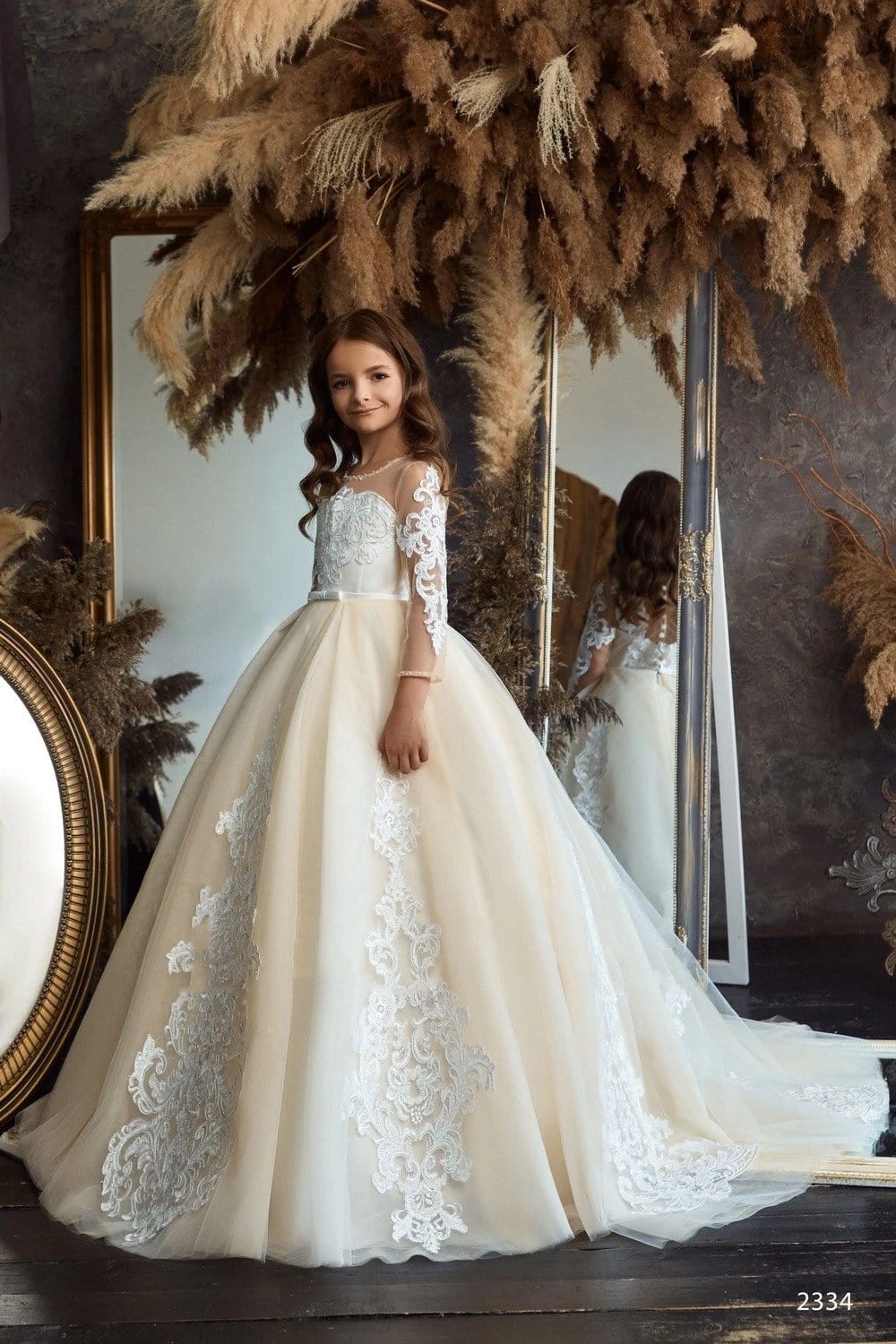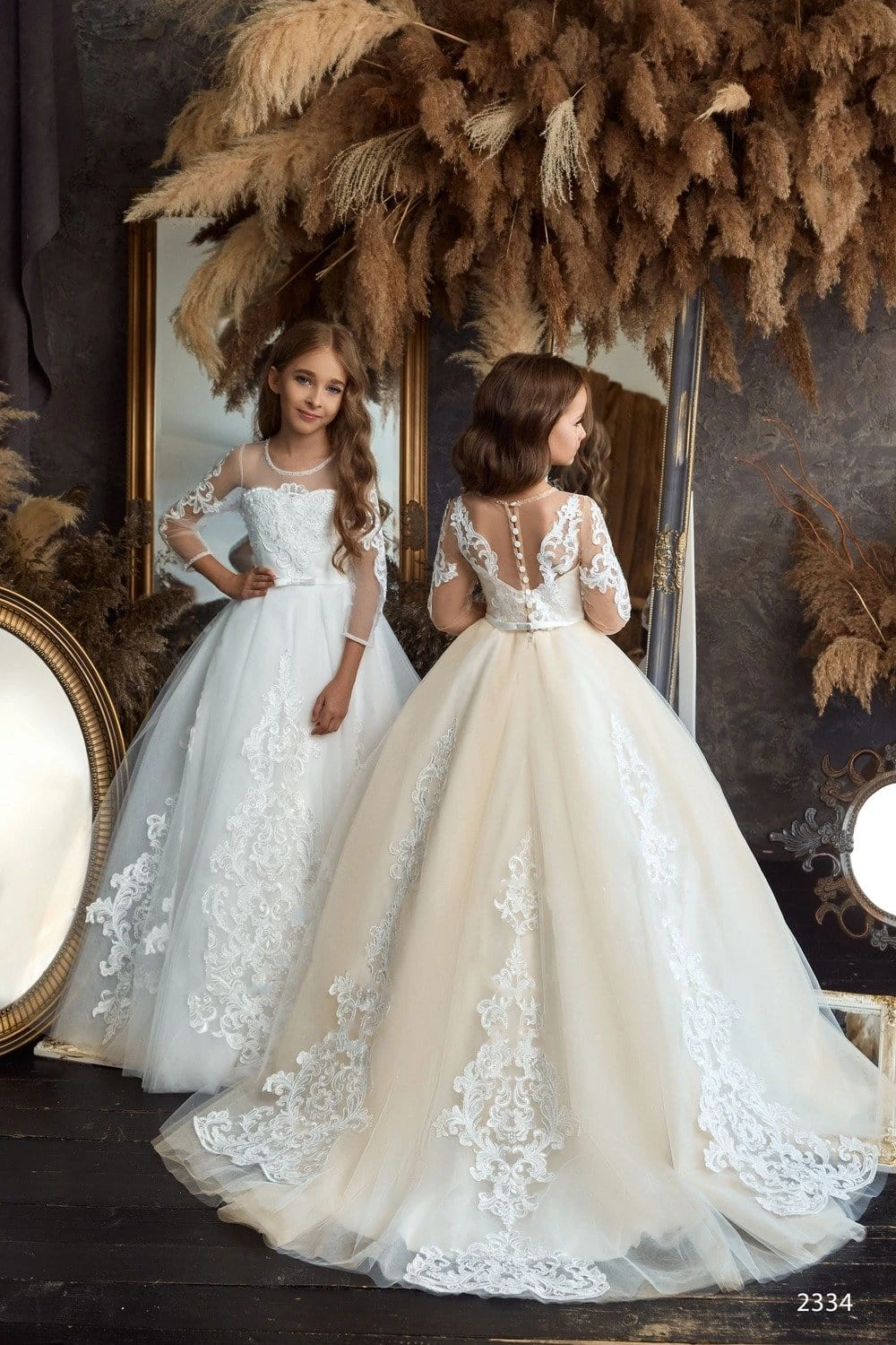 Long white wedding ballgown for young girls. Dress with sheer sleeves and shoulders perfectly styled for an old-world classic wedding. This dress has a sweetheart neckline. The bodice, sleeves, and skirt are fashioned with lace embellishments. You won’t be able to wait to see her walk into the room wearing this lovely bridesmaid dress. A voluminous skirt stiffened by the most delicate tulle adds to the lightness of this beautiful formal dress. Available colors: cappuccino, ivory, or blush.