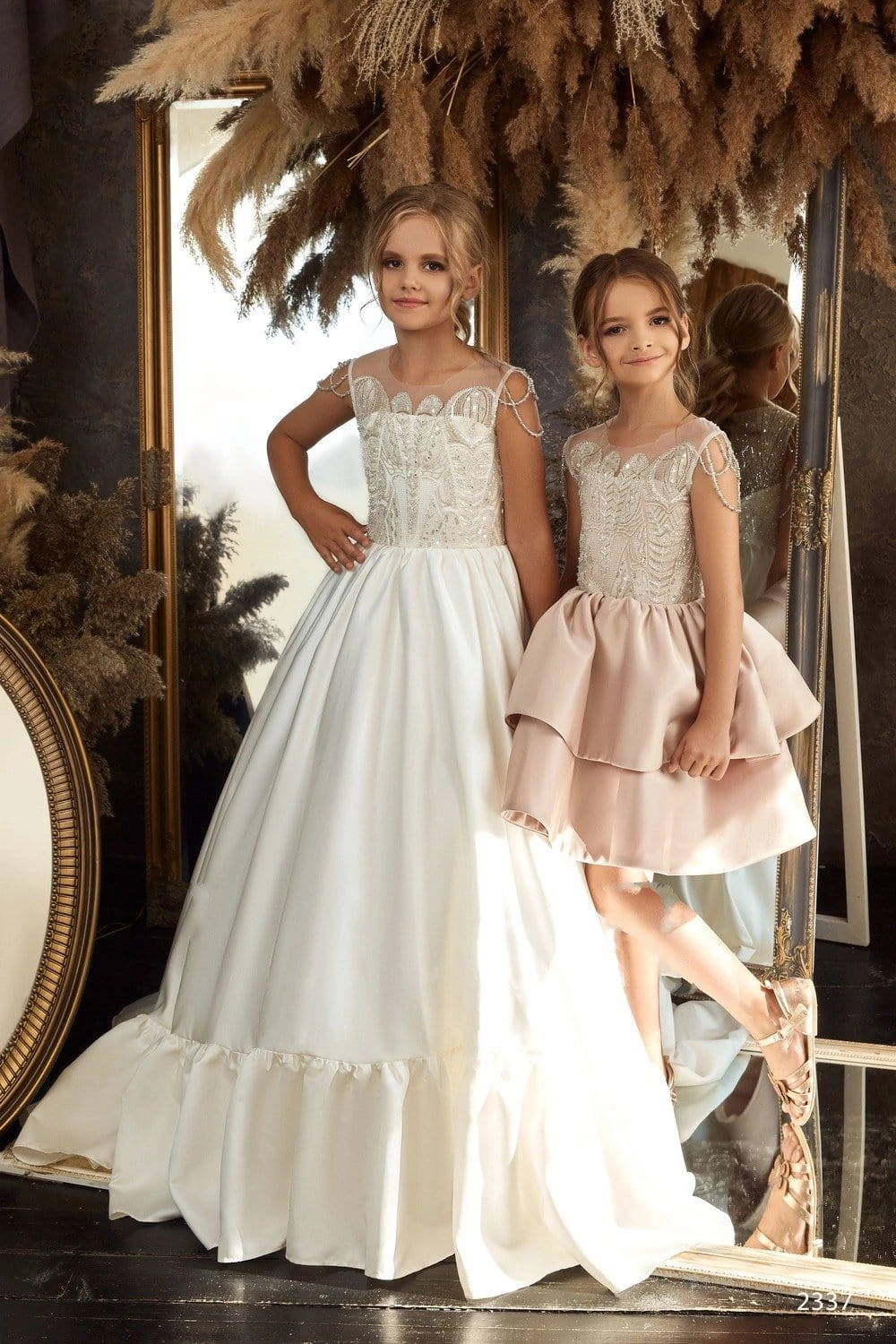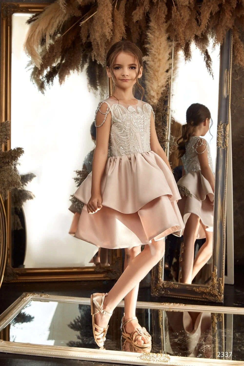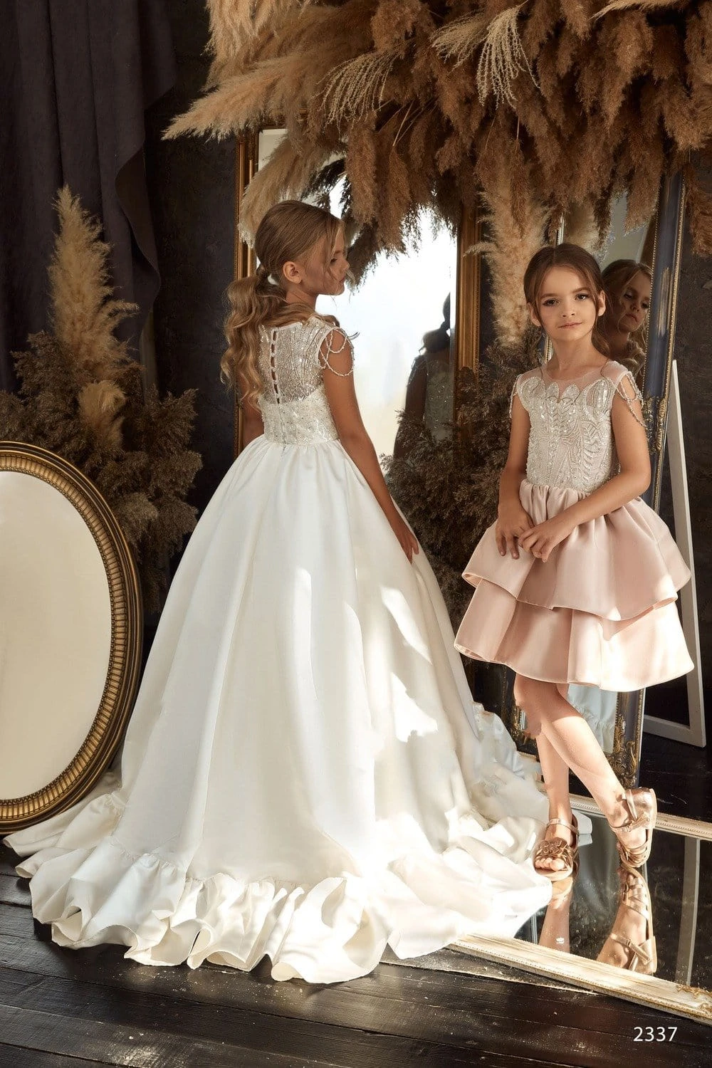 This prom dress for school graduation is perfect for 5th-grade prom or 8th-grade prom parties. The heavily beaded feather motif on the bodice creates the scalloped neckline effect. Crossed bead strings drape over the shoulders. The skirt of the dress is offered in two designs. The longer-length skirt gathers from the natural waistline and softly falls and culminates in a ruffled tier. The alternative shorter skirt has a ruffled tiered style and is slightly above the knee. Available colors: off-white, cappuccino, or blush. Fully lined.