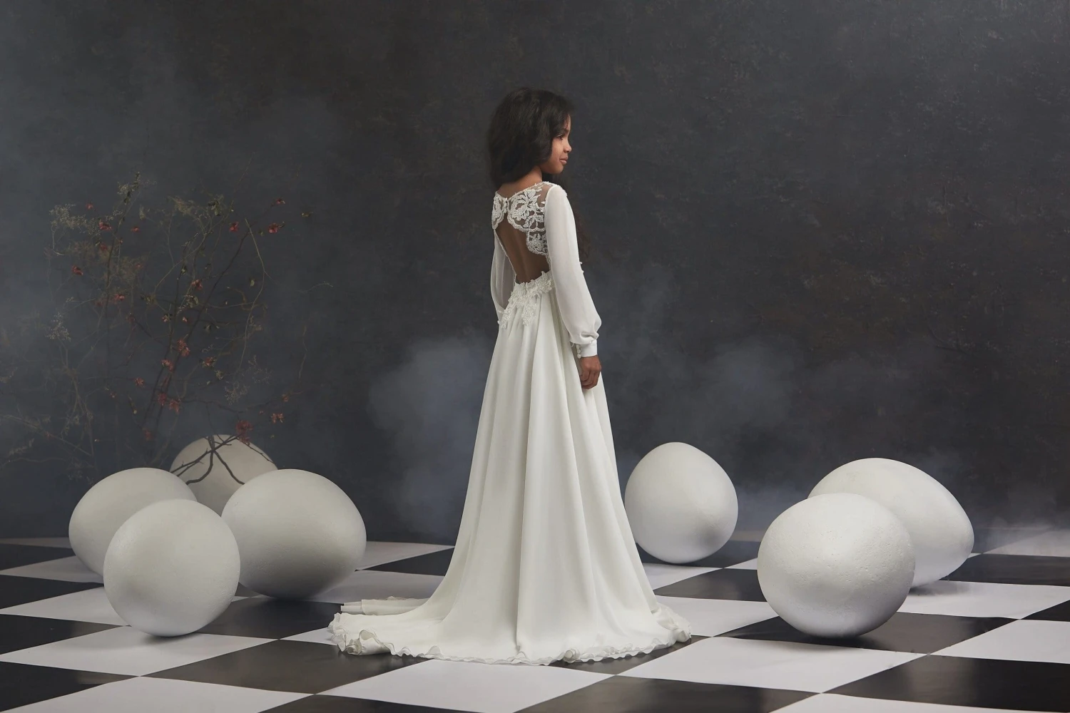 Beautiful lace and chiffon A-line gown featuring embroidered lace bodice with a sheer illusion neckline and vintage bishop sleeves. Thin satin belt to enhance the waistline and a low embroidered cutout back for a stylish touch. Also available in white / ivory.