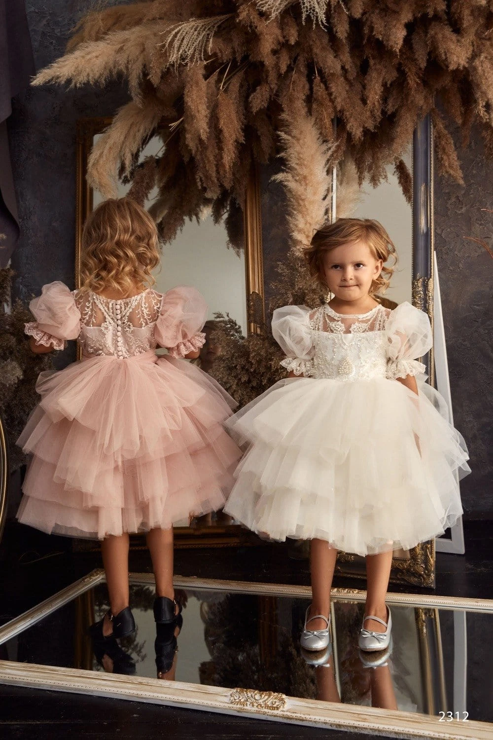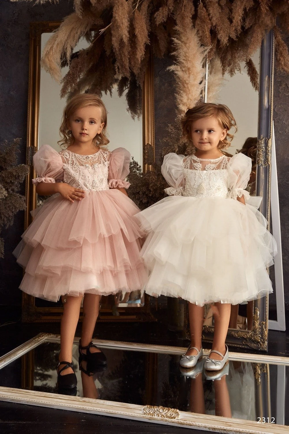 A breathtaking Lavino puff sleeve dress for girls. It is featured with a corset bodice and a multilayered tulle skirt. Short puff sleeves top is finished with floral lace appliques, while a sheer neckline is beaded with crystals. The Lavino puff sleeve dress back has a zipper closure under the row of covered summarys, the laced fastening, and a satin sash bow with rhinestones.