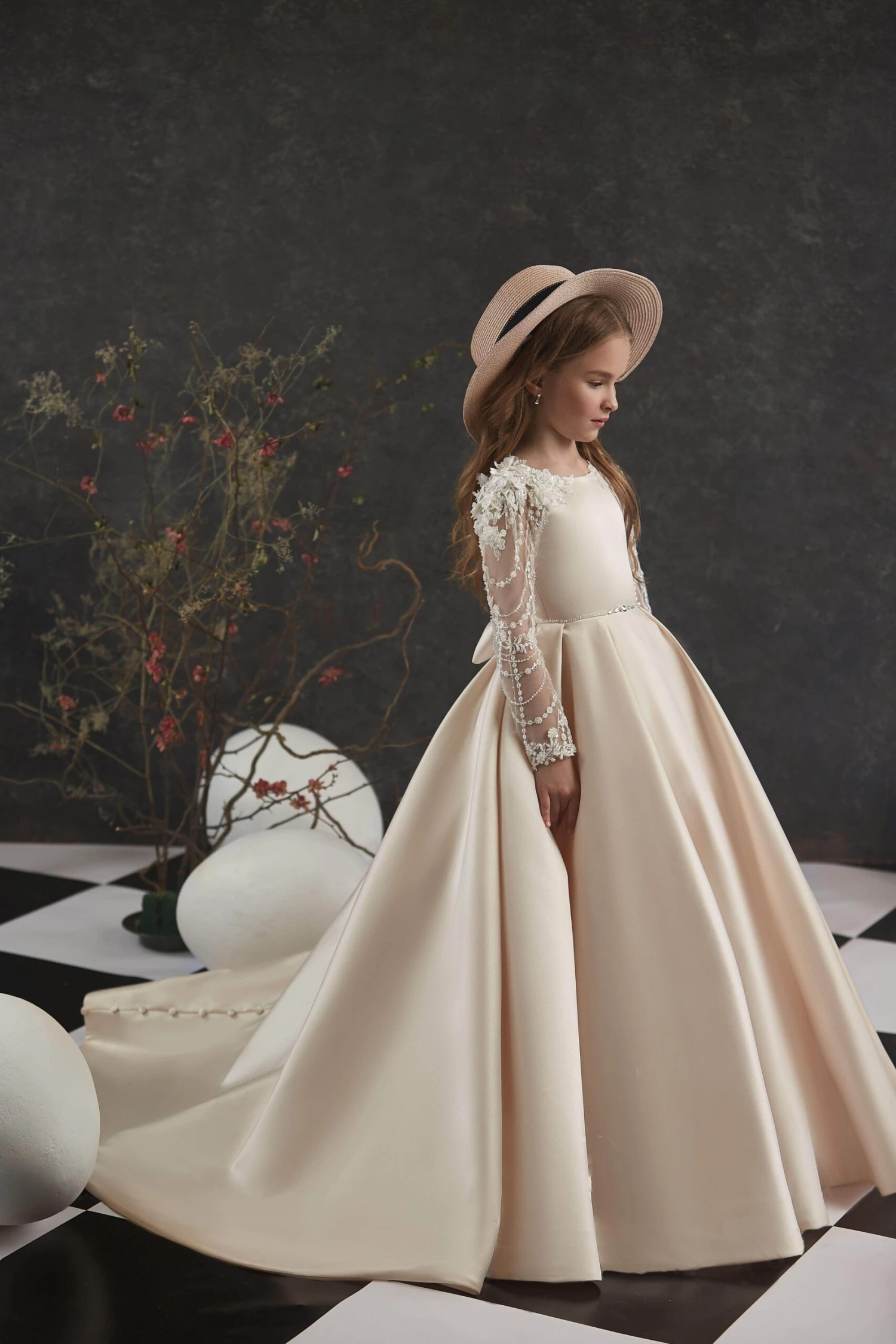 An elegant little girl’s satin gown with lace sleeves will look fabulous on a big day! Perfect for weddings, pageants, celebrations, and family portraits. It features a fitted bodice with long illusion beaded lace sleeves, a scoop neckline, and a keyhole back. The shoulders and cuffs are decorated with tiny dimensional flowers. A crystal chain encircles the waist, while a large bow sits at the back. Deep folds of satin fabric add volume to this gorgeous ball gown skirt adorned with covered summarys running down the back into a chapel train.
