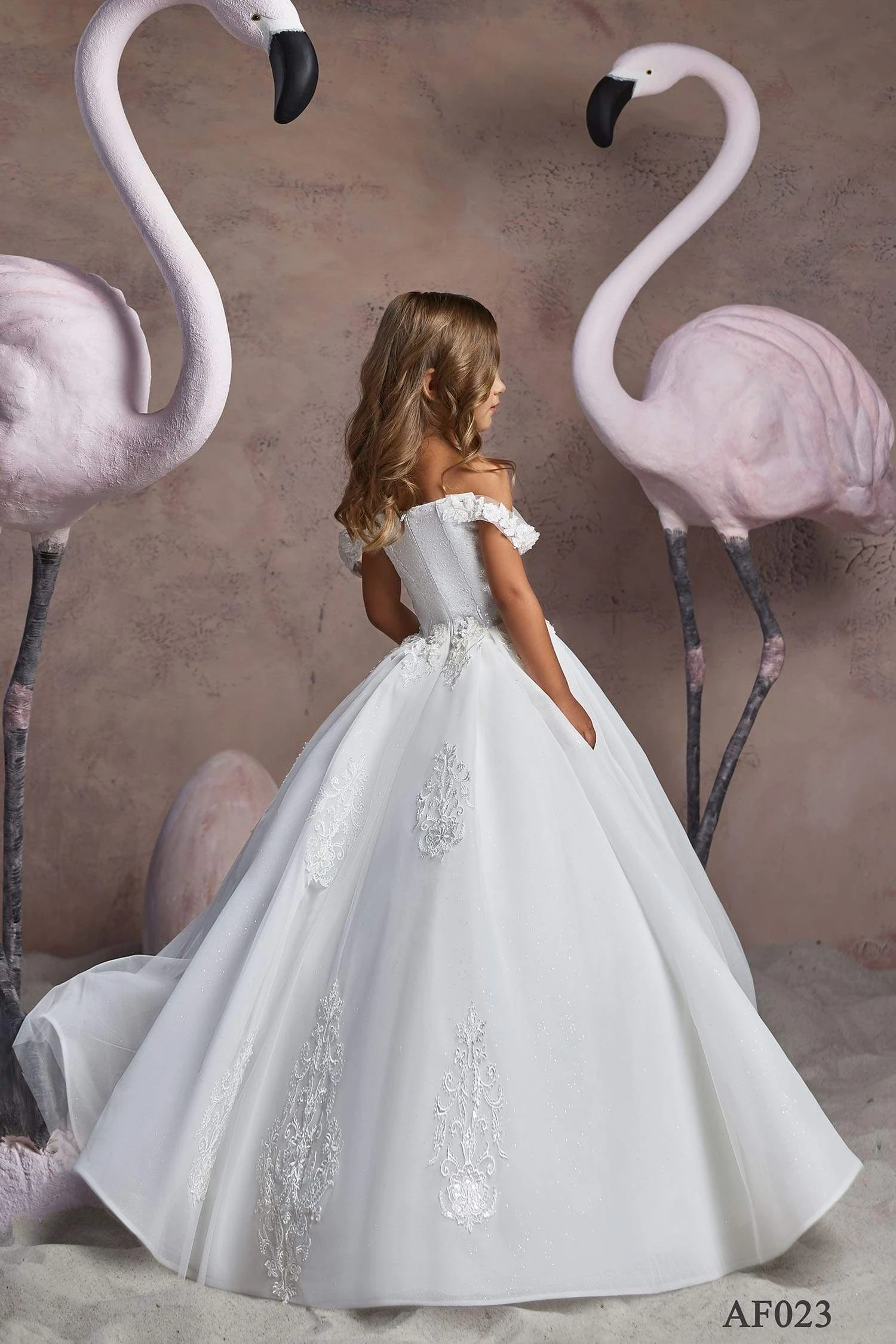 So sweet little girl’s off-the-shoulder dress can easily match your bridal style. This soft white dress features a cold-shoulder neckline, a slim-fit top, and a gorgeous soft-pleated to-the-floor skirt. While covering the top and the sleeves, delicate lace appliques create a beautiful pattern on the skirt. It’s the perfect flower girl dress to impress your wedding guests and take unforgettable pictures on your big day!