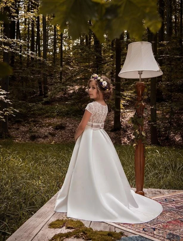 The Ljubljana is a simple First Communion/Baptism dress with an adorable lace back by MB Boutique Canada. The Ljubljana A-line silhouette features a round neckline, lace cap sleeves, and beautiful lace back. Delicate lace motifs embellish the neckline and the hem of the skirt. Covered summarys complete the back. The skirt extends into an elegant short train. A sash with a satin bow adds the finishing touch.