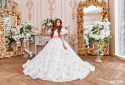 The Lombardy Flower Girl Dress For Wedding by MB Boutique Canada. The Lombardy is a chic blush colored gown with train for an extraordinary wedding. The dress features a bateau neckline, cup sleeves, and bodice that have floral lace accents. The contrasting colored bottom of the skirt features multi-layered gathered tulle that comes with a brush train. A small accent bow adorns the front and a tie bow completes the back of this magnificent dress.