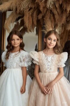 This long-sleeved First Communion dress is simply stunning. The focal point of the gown is its lace butterfly sleeves. A V-cut back and the front are covered with matching lace. An elongated skirt of the A-line silhouette is trimmed with frill detailing. A row of covered summarys and an oversized sash bow at the back follow the 2022 wedding trends.