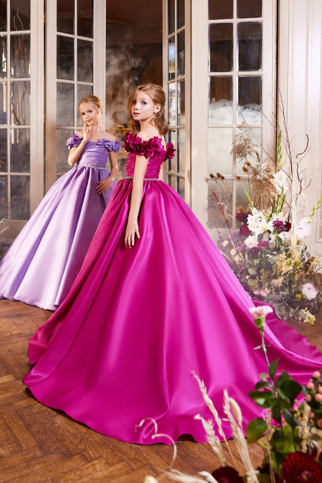 Turn heads with the breathtaking Magenta Dress for Flower Girls, a stunning junior bridesmaid gown perfect for weddings, Christmas, or birthdays. Available in Magenta, Lilac, White, and Ivory, this elegant satin dress features an off-the-shoulder neckline adorned with delicate silk flower trim. The pleated bodice, rhinestone-embellished waistline, and full satin skirt with a flowing long train create a regal look. A self-tie bow and hidden back zipper ensure a flawless fit. Make any special occasion unforgettable with this enchanting dress from Mia Bambina Boutique Canada. Order now!